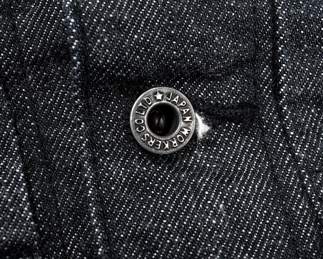 新しく作った小ぶりのWORKERS刻印入りドーナツボタン。古いデニムジャケットで見られる小ぶりボタンをデザインとして取り入れてみると・・・ブラック系のうっすら塗装でボタンがさらに小ぶりに見える。またなぜか、クラシックな雰囲気にも見える。