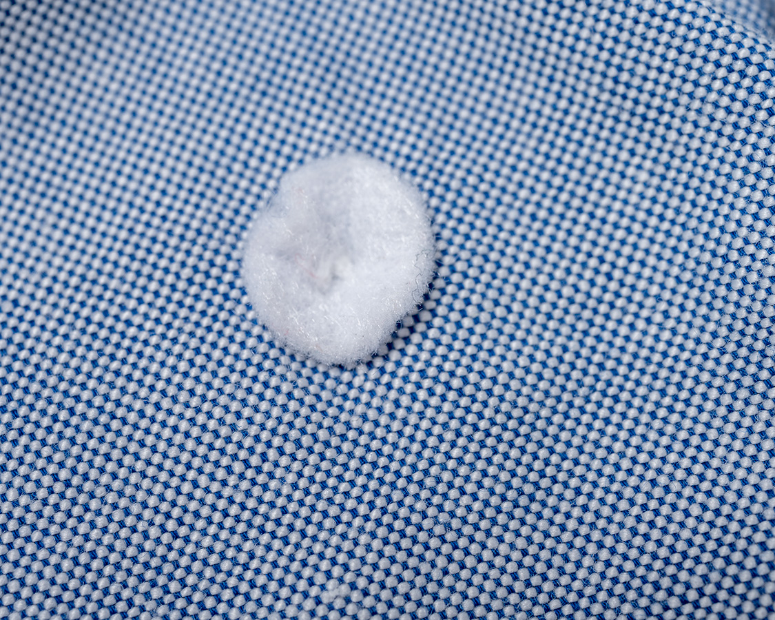 ボタンダウン、襟が止まる小さいボタンの裏には補強の丸い芯をつけています。小ボタンは身頃1枚部分にボタン付けするのですっぽ抜けるといけない。強度を上げるためのひと手間。
