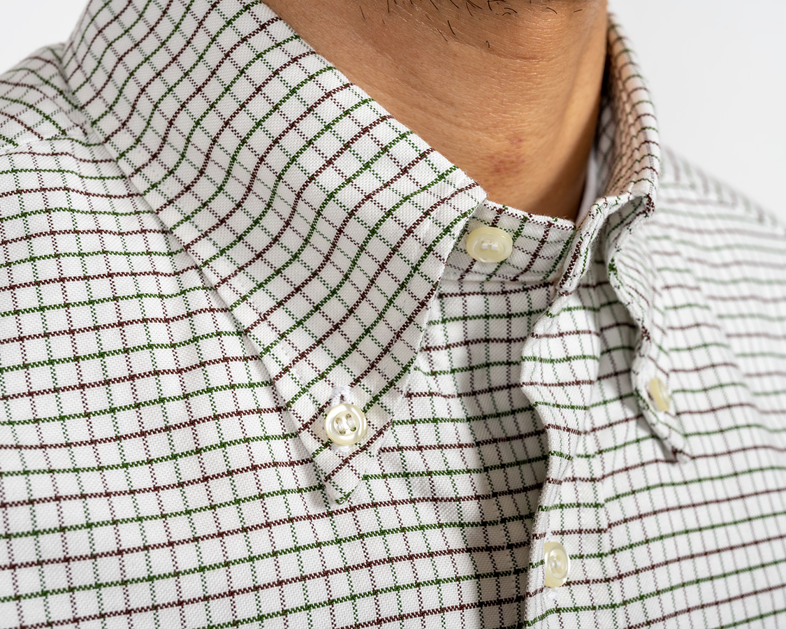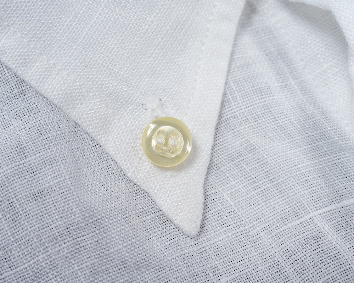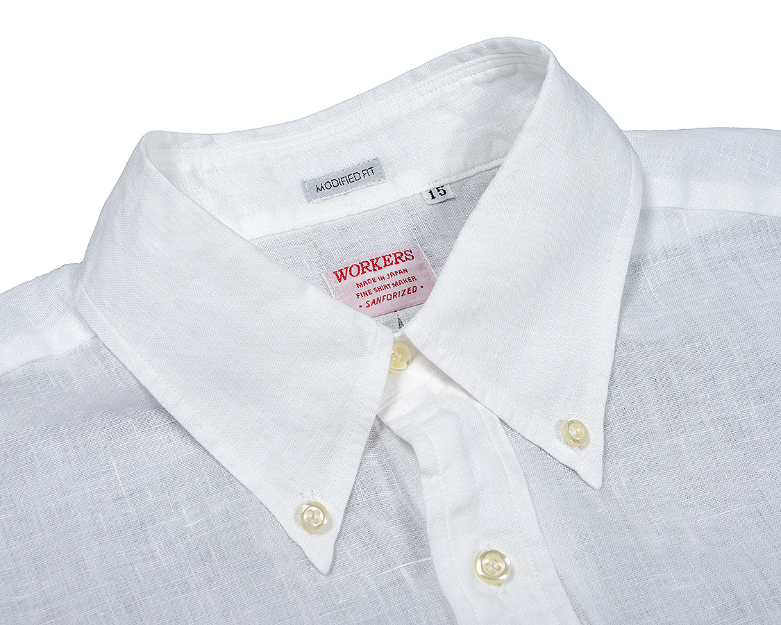 WORKERSでは台襟のボタンを開けて着た時に適度なロールができるよう位置を決めています。
