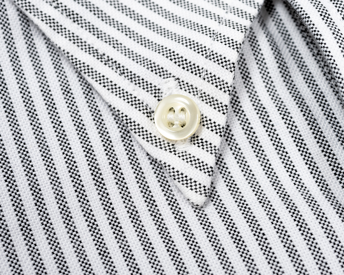 羽襟先のボタン。襟ステッチにかかるぐらいの位置。厚手のオックスでもきれいにひっくり返っている襟先。やっぱり、こういう部分は「シャツ専門工場」の仕上がりの良さがわかる部分です。私もよく「服縫えるの?」と聞かれますが、形にはできます。でも、中々きれいに出来ないのがこういう襟先とかひっくり返す部分。道具も要るし、一日にそこを何十枚をやるからこそ、量産の独特な「うまさ」が出る部分です。