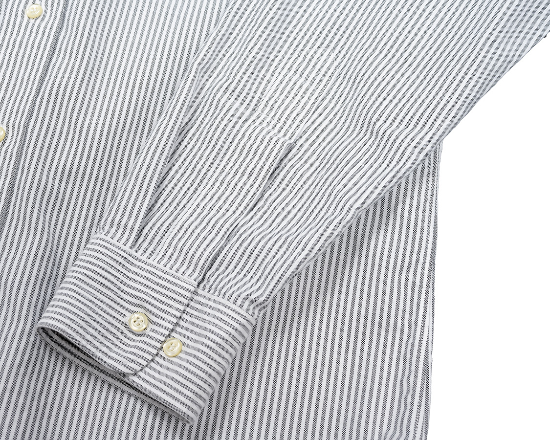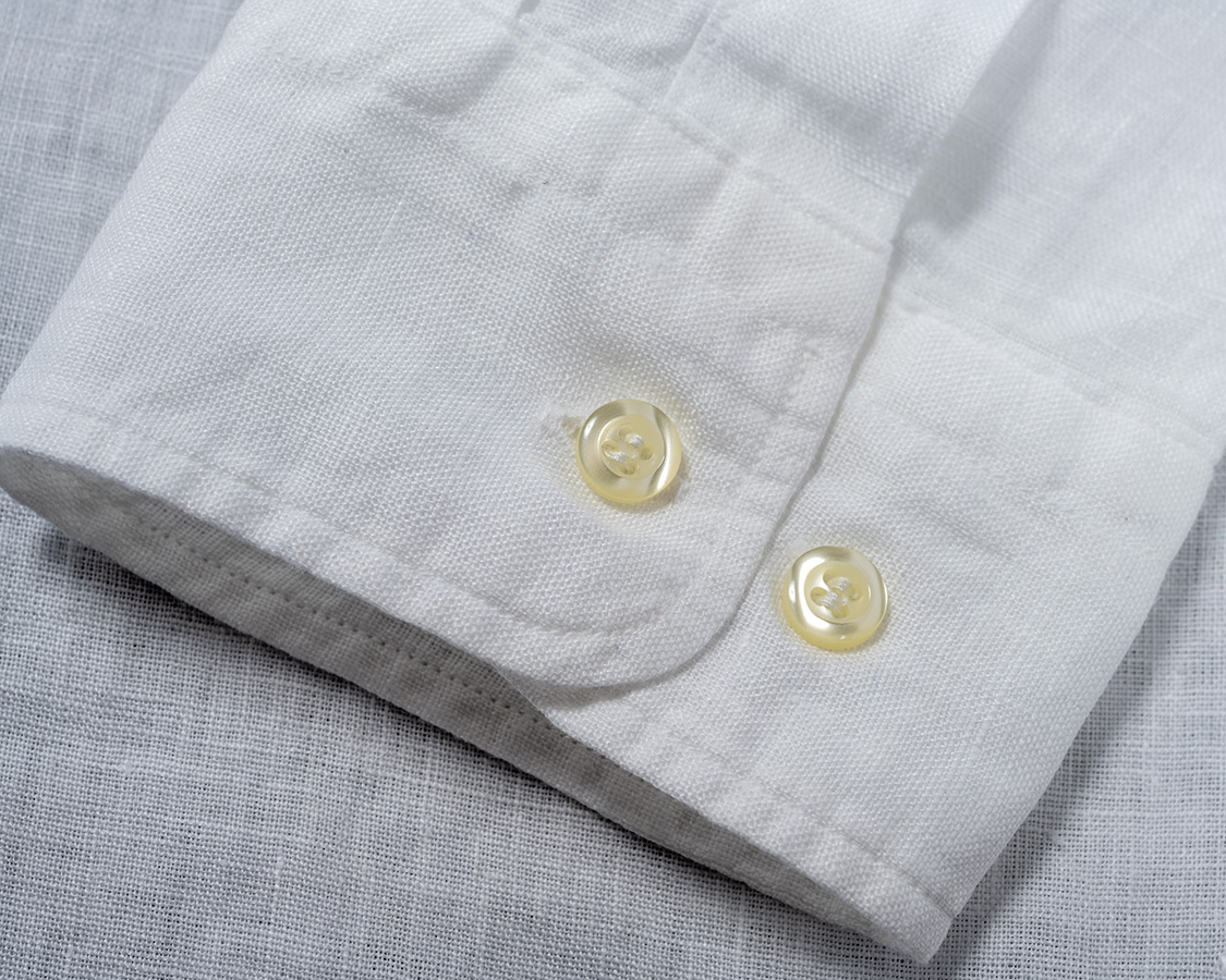 調整ボタン付きカフス。芯止めステッチが入り、そのステッチは表カフスのみで裏には貫通しない。ボタンホールは「パール」と通称呼ばれる目が立った形状。