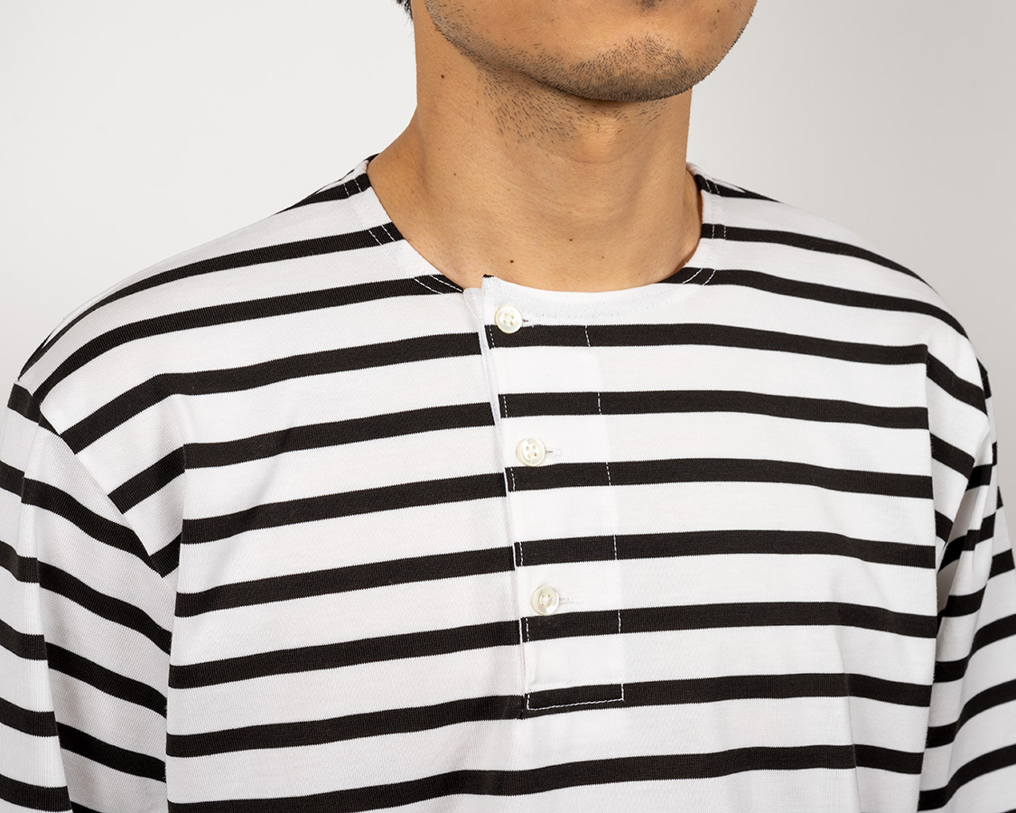 脇よりにオフセットされたヘンリーネック。もともと、おそらくアメリカ物のウール肌着から着想を得た仕様。