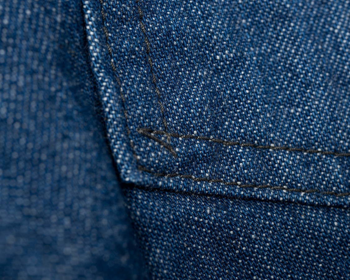 角々に糸のワタリ。二本針ミシンで縫うから出る仕様。はるか昔、ビンテージは「針位置停止」が無いので、左右の針が同時に進んでしまい、嫌でも「出た」もの。現代では、片方の針を停止する機構があるので出さないこともできます。そこをあえて「出して」と頼んで出してもらっている物。