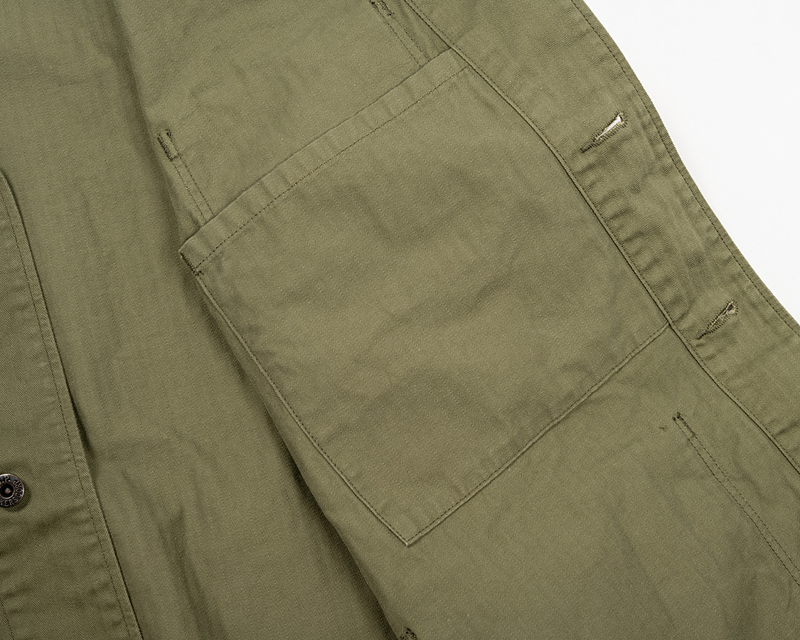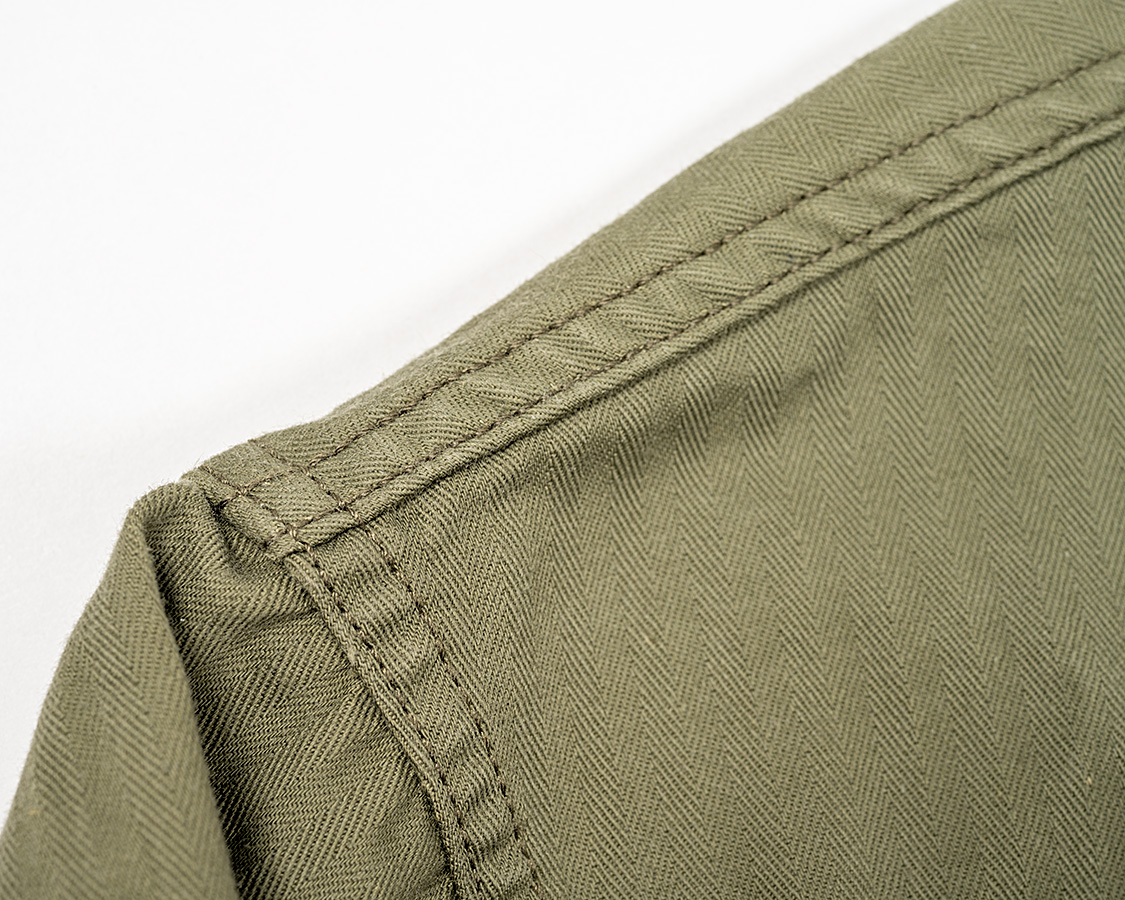 一般的に、P-41はもう少し角ばった胸ポケット。P-47は丸みがある・・・と言われていますが、個体差もあるので何とも言えません。今回は参考にしたオリジナルの丸みを参考に。さらに、オリジナルがきれいにペン差しステッチが外されてしまっていたのでそれも真似てみました。本来なら、ペン差しステッチがありそれをちゃんと真似てますよ!というほうが「リプロ」的には正解ですが、そういうのは別のブランド・メーカーさんがいくらでもあるので。
