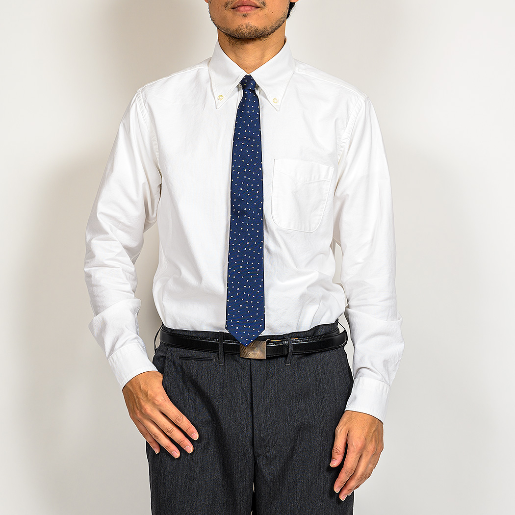 ポプリンは3オンスクラス。真冬はちょっと寒いが、真夏まで着られる薄手の生地。そのままだと襟・カフスは形がうまく出ない、フロントのホールは強度が足りないので、薄手の芯を中に入れています。