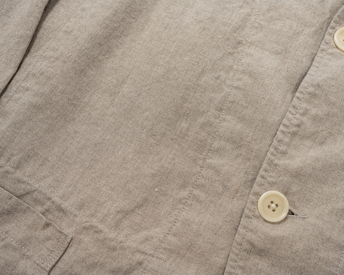 リネンは5オンス程。オンスはある程度ありますが、太い糸でざっくり織られているので向こうが透けて見える。この隙間から風が通って涼しい。ほぼチクチク無し。それでも気になる方は5回ほど洗うと、 かなり柔らかくなります。腰が無いのとは違う、リネン独特のプリっとしたハリはちゃんと残ります。 |
