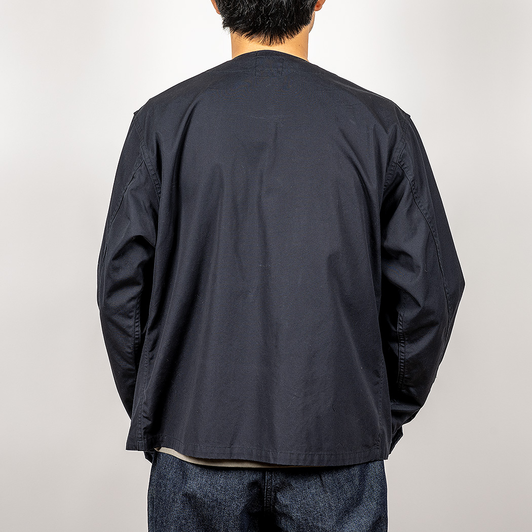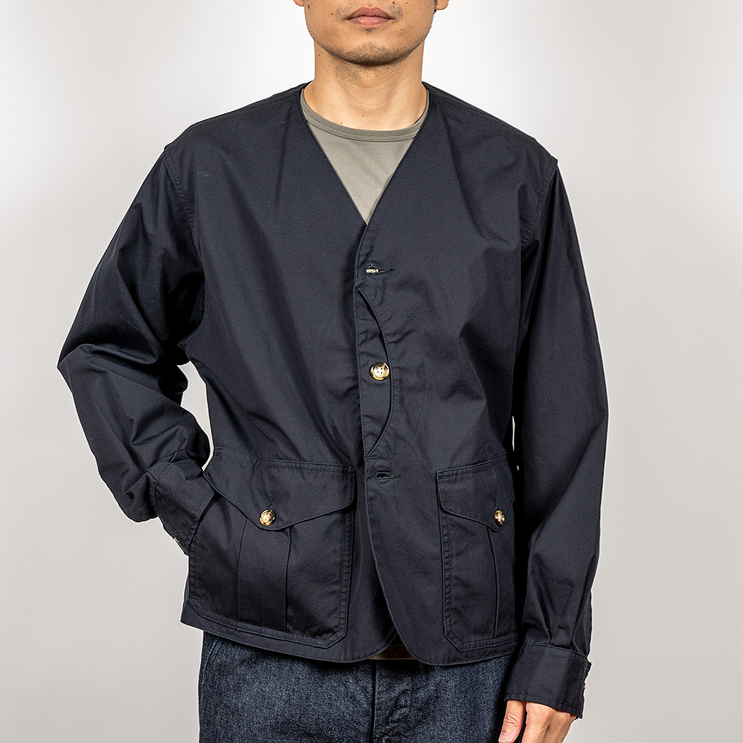 前丈を伸ばし、ポケットをギリギリまで下げる。襟回りはベストと同じカラーレス仕様に変更。袖口も広すぎず、狭すぎないよう微調整して出来上がったのが最終サンプルです。