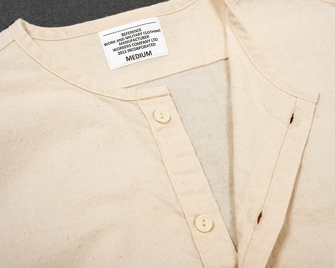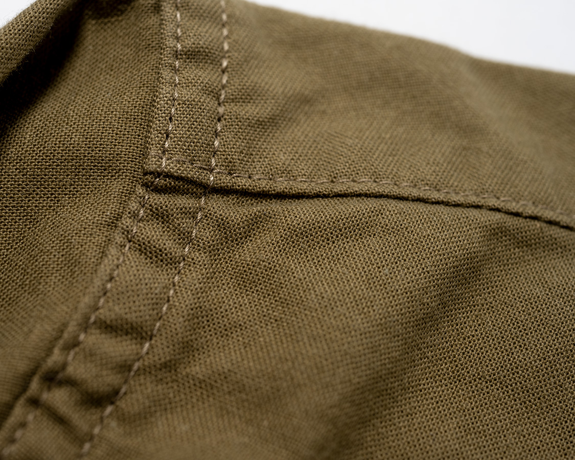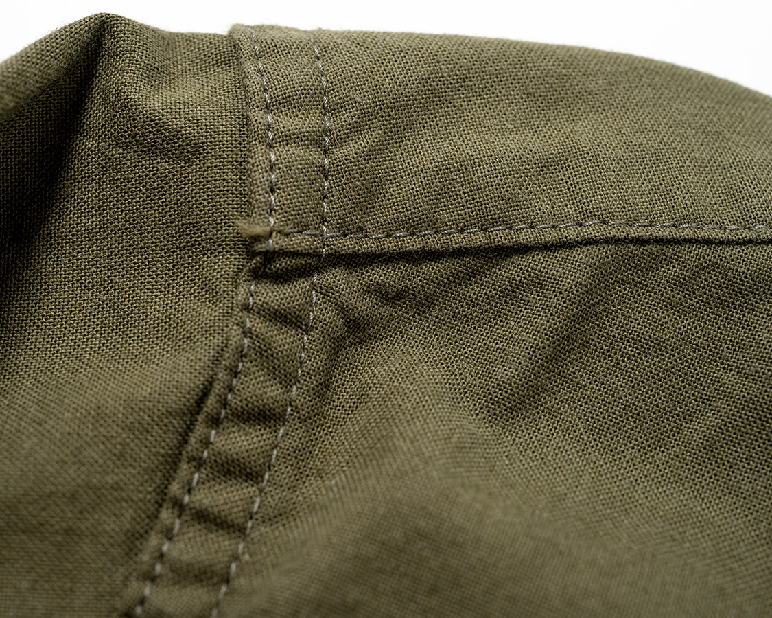 フロントの開き。袖口の剣ボロ開きと同じような仕様。平ミシン始末で、切り込みも深くは入っていないので強度OK。