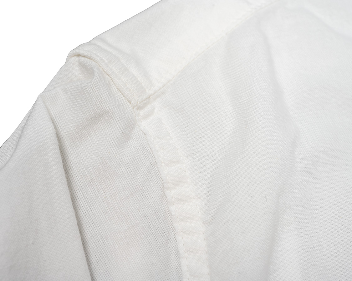 袖ぐりは巻縫い。ダブルステッチで裏がチェーンになっています。