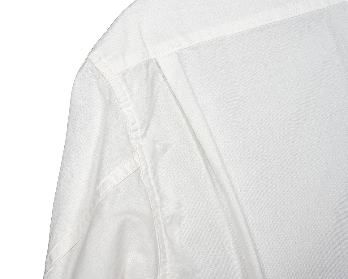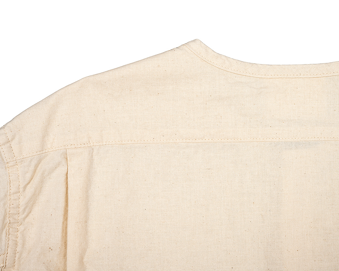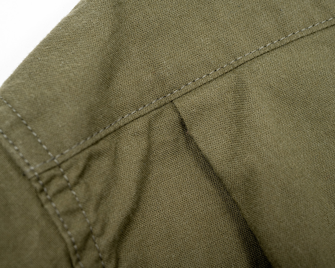 背面、ヨークをつけて身頃はタックを入れる。これで、肩幅はある程度収まりが良く、かつ身幅にゆとりが出て突っ張らない。
