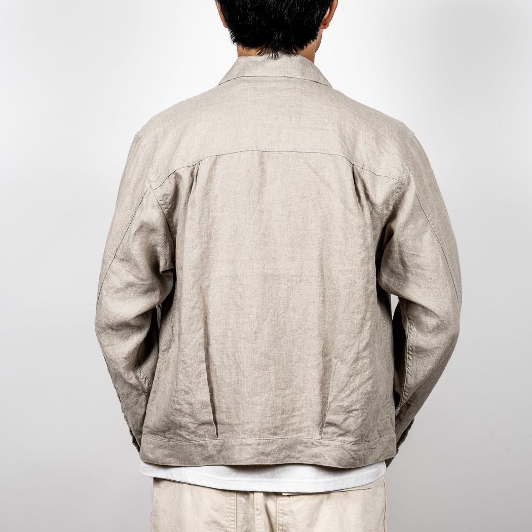 リネン、夏の定番素材。5オンス程でほぼチクチク無し。このなめらかな手触りは織った後の洗いや染めにあります。滋賀にある生地の加工屋さん、徹底的に何回も揉んで、洗って。自然な柔らかな風合いになるよう乾燥もベルトコンベアに生地を乗せてものすごく大きな乾燥機で「ふわっと」乾かす。揉んだり・洗ったり・乾かしたりも一度で求める風合いにならなければ、何回も工程を繰り返したり。その工程も「なんとなく」ではなく、きちっとデータ・仕様になってそれぞれの生地・色ごとに管理。だから、この風合いが安定して生み出せているわけです。