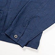 リネン、夏の定番素材。5オンス程でほぼチクチク無し。このなめらかな手触りは織った後の洗いや染めにあります。滋賀にある生地の加工屋さん、徹底的に何回も揉んで、洗って。自然な柔らかな風合いになるよう乾燥もベルトコンベアに生地を乗せてものすごく大きな乾燥機で「ふわっと」乾かす。揉んだり・洗ったり・乾かしたりも一度で求める風合いにならなければ、何回も工程を繰り返したり。その工程も「なんとなく」ではなく、きちっとデータ・仕様になってそれぞれの生地・色ごとに管理。だから、この風合いが安定して生み出せているわけです。