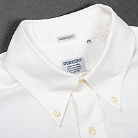 一見「なんでもない、半そでのボタンダウン」ですが、ぜひ裏返してご覧ください。袖ぐりはチェーンステッチを使った 折伏せ縫い。脇は極細の折伏せ。裾の三巻の美しさ。フロントももちろん、チェーンステッチ、専用ミシン・金具を使っ て。それがすべて、極細の綿糸で細かいピッチで縫われています。「どこにでもある服」のように見えてやっぱり違います。BDはノンウォッシュ納品。洗うと若干、1-2センチ程度縮みます。