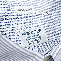 今年はWORKERS 定番の5 オンスでホワイト/ ブルー/ ストライプ。Ecru のストライプ/ チェックはWORKERS 別注色。グリーンチェックだけが少し薄手のライトオックス。