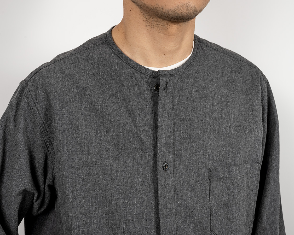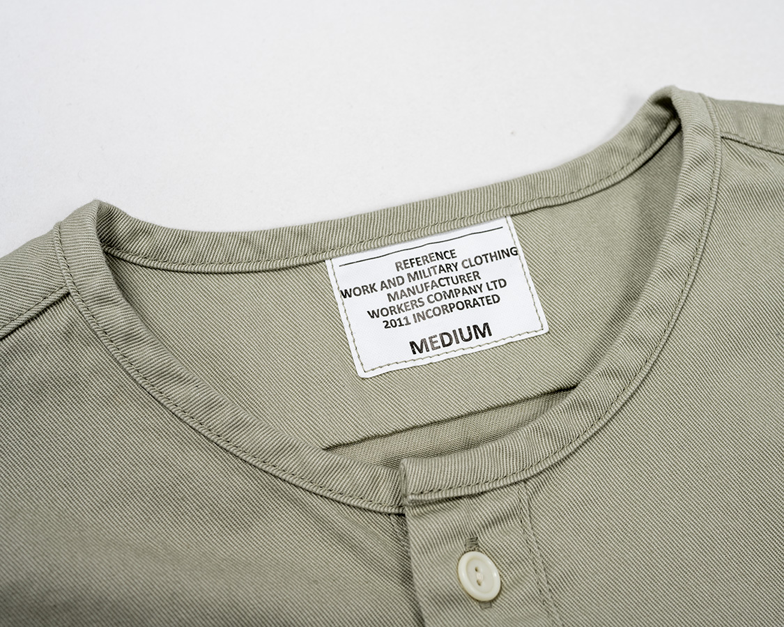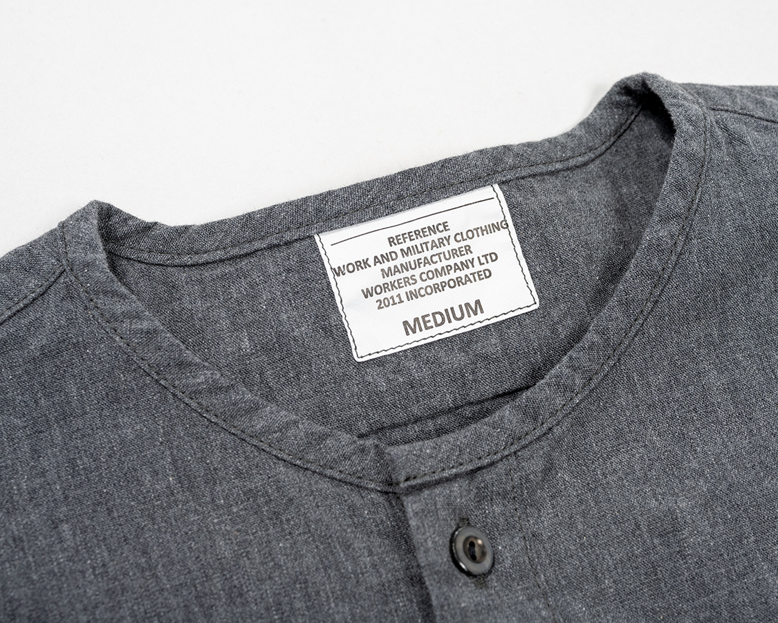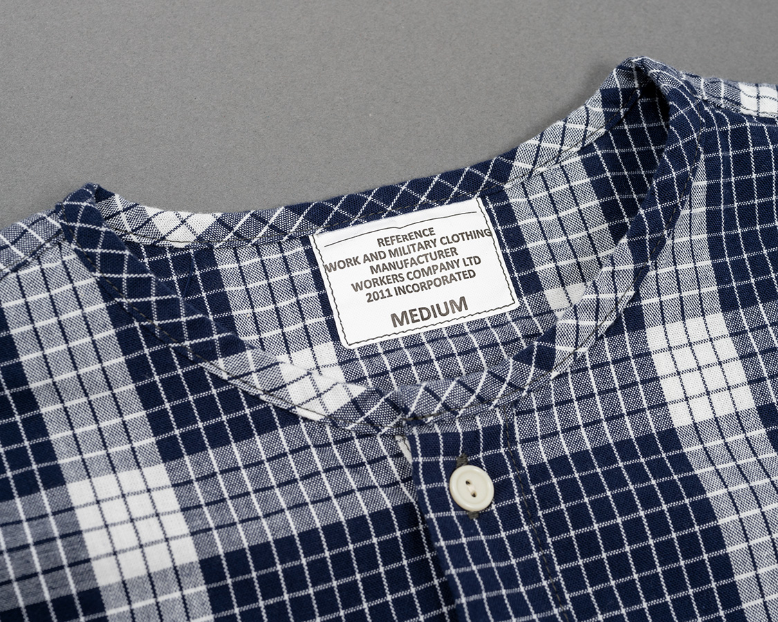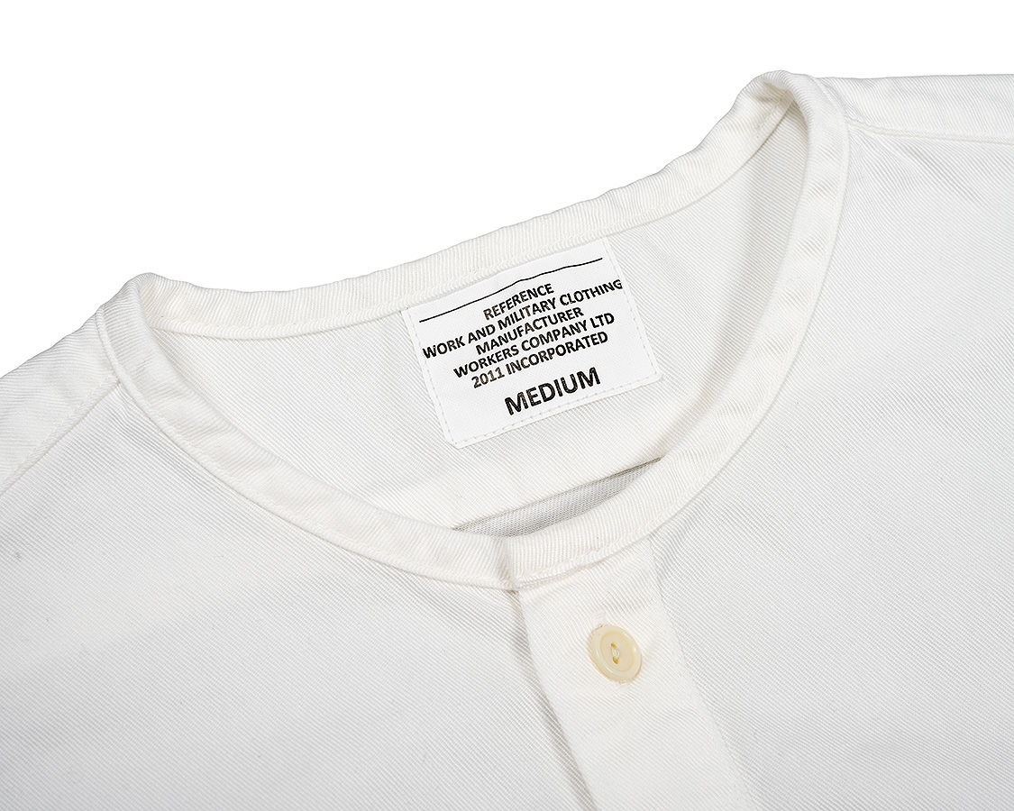 ミリタリー風のネーム。首回りは細めのパイピング。ここがバンドカラーと違うところ。バンドカラーは細いながらも襟がついているが、Sleeping Shirtは身頃の首回りを身頃と同じ生地でくるんでいる。