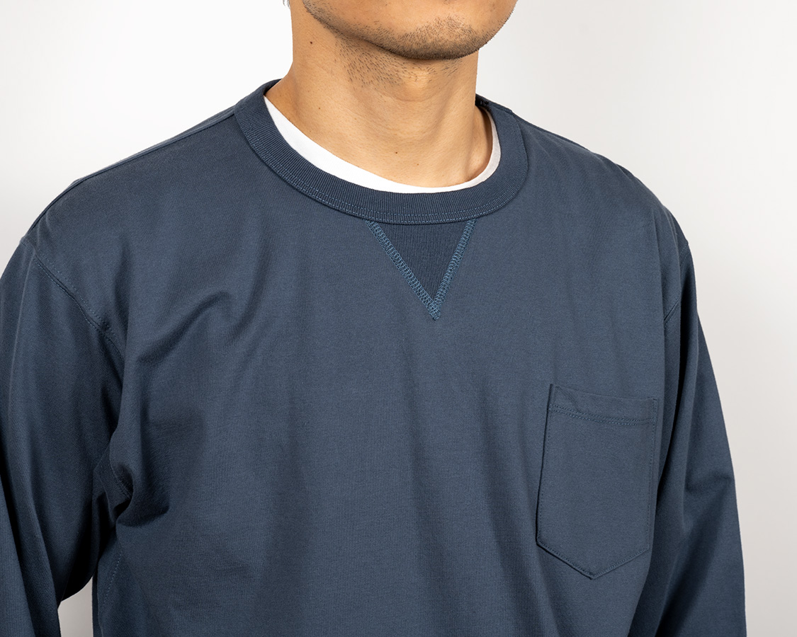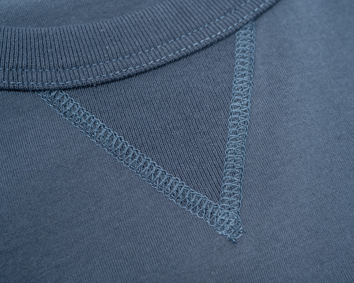 前Vアップ。身頃の天竺とは組織が違う、フライス(リブ)が三角にたたきつけられているのがよくわかります。