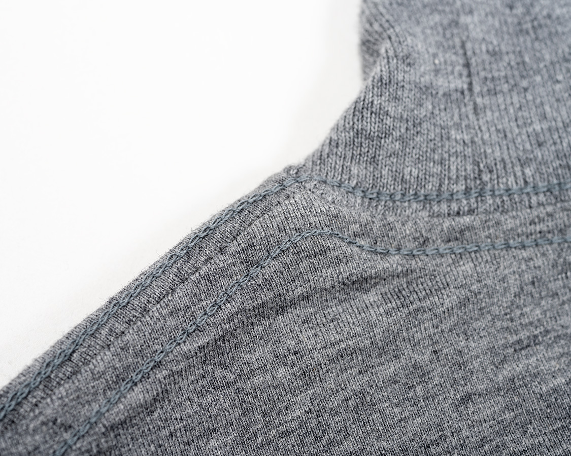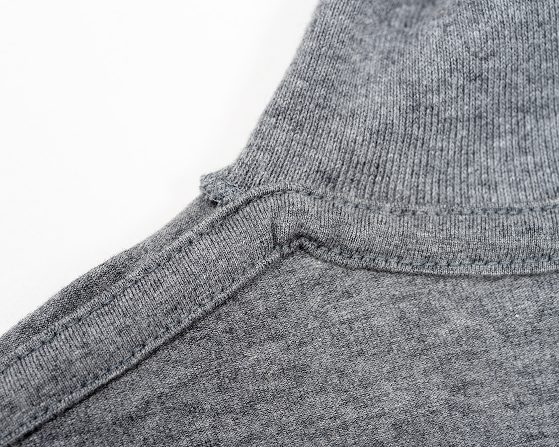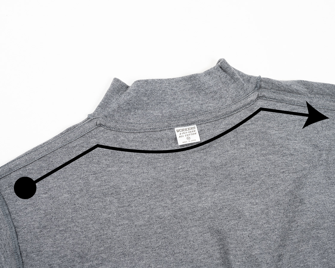 裏から同じ部分。リブを左右折った帯状のパーツを肩〜後ろネックにかけて二本針環縫いでたたきつけています。だから表にはチェーンステッチが出ています。