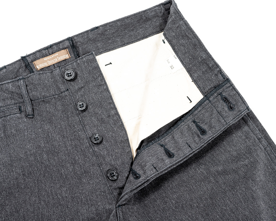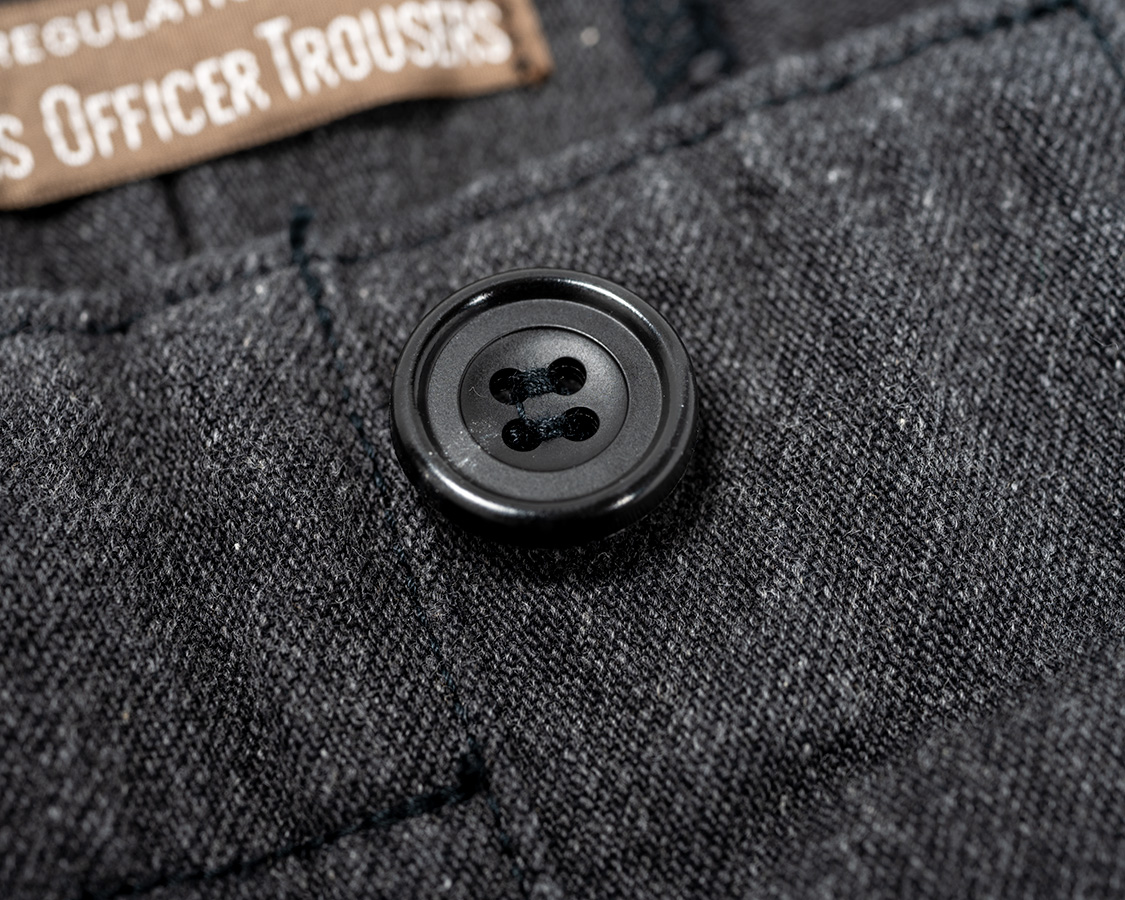 後ろ中心にOfficer Trousersネーム。尻ぐりは割り縫い。お直し屋さんでサイズ調節がやりやすいように。尻ぐりは二度縫いしていますが、どうしても無理に力をかけると裂けます。特に、屈伸のような動き、車に乗り込む時に股を開いたときなど等・・・裂けてしまった時は、その部分を少し手縫いで良いので縫ってください。