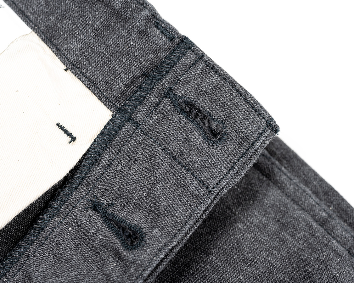 ボタンホールの間、見返しを比翼を止めるステッチ。表には貫通しません。クラシックなトラウザーズの仕様。