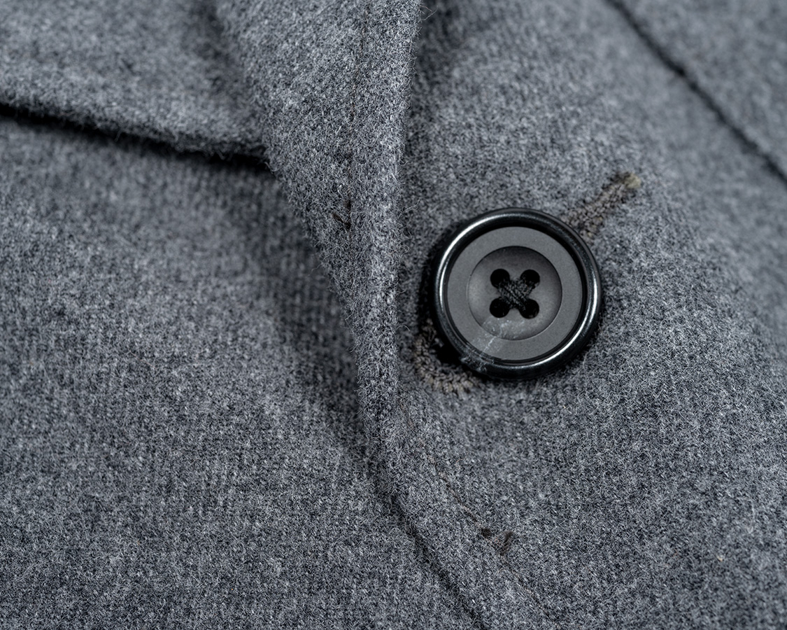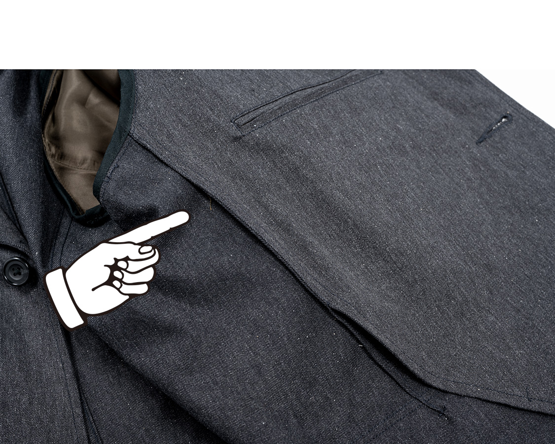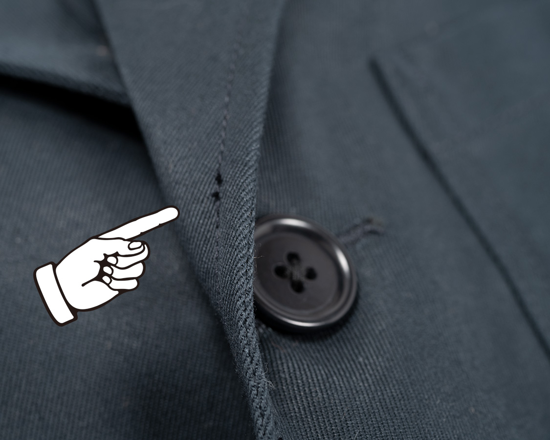 あえて一度止めている前端ステッチ。ここから上はラペル側表目、ここから下は身頃側表目。着た時にどちらもステッチの表目が出るように。