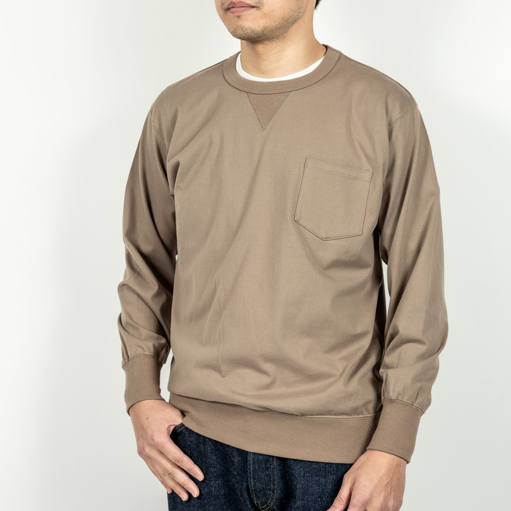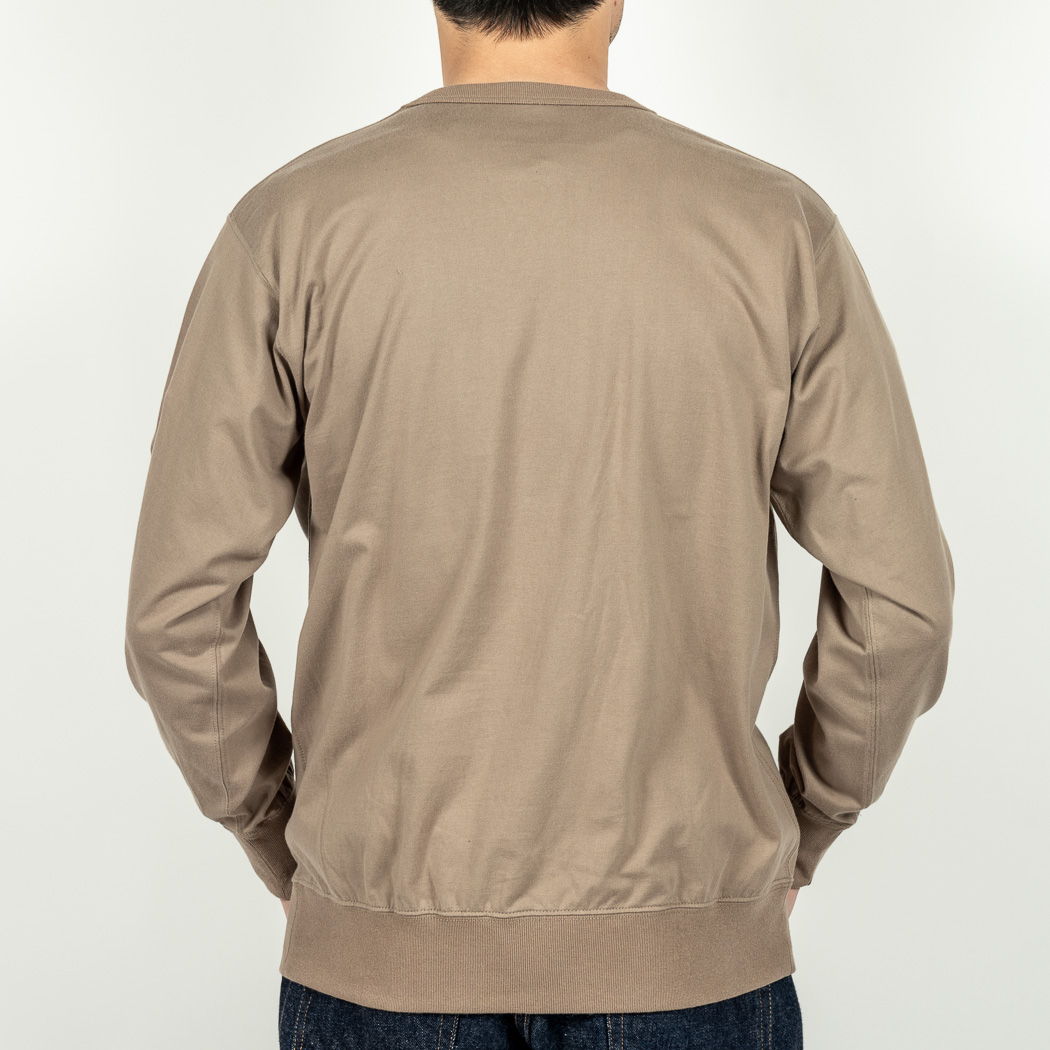 3 PLY Sweat Shirt、仕様はスウェットそのもの。前 V たたきつけ、袖口・裾はリブできゅっと絞る。首回り、リブ太め バインダー始末。首回りをリブでパイピング状に縫うので厚みが出て伸びにくい始末。