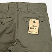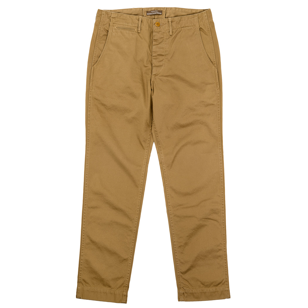 おなじみ、古今様々なチノパンを混ぜて作ったWorkers Officer Trousers。Slim Fit 「Class 2」、脇巻き縫い・ダブルステッチバージョン。