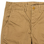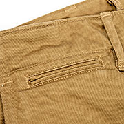素材は10オンスクラスの高密度チノ。USMC Khaki色はWORKERS別注品。通常の白っぽいベージュではなく、もっと濃い黄土色。USMCと思しきチノパン から色を取ってます。