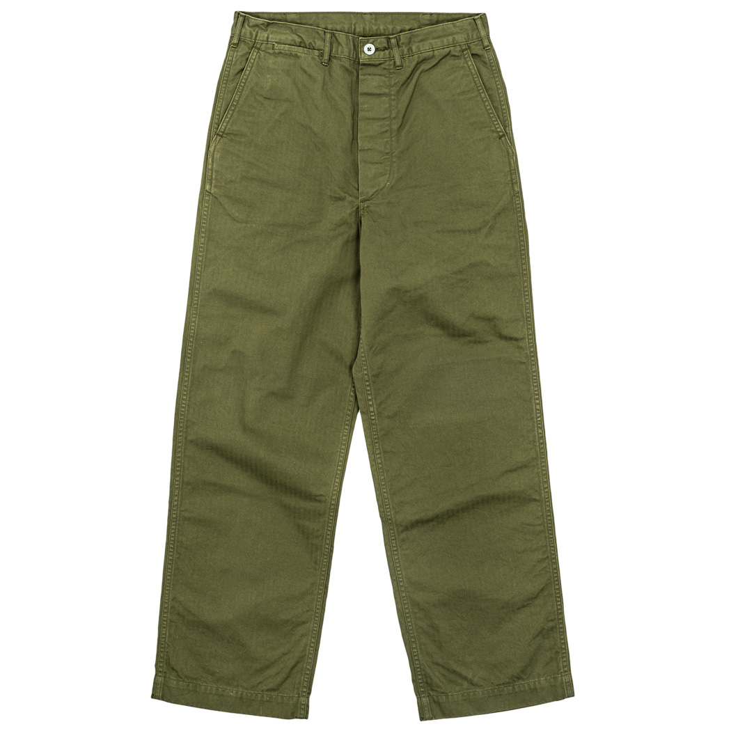 素材、 ミリタリーと言えばのヘリンボン、こちらもデニムと同じ10オンスクラス。真冬はインナーはかないと寒いですが、夏場はゆったりシルエットとあいまってある程度涼しい。(Summer TrousersやFWPの5オンスクラスよりはしっかり)