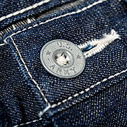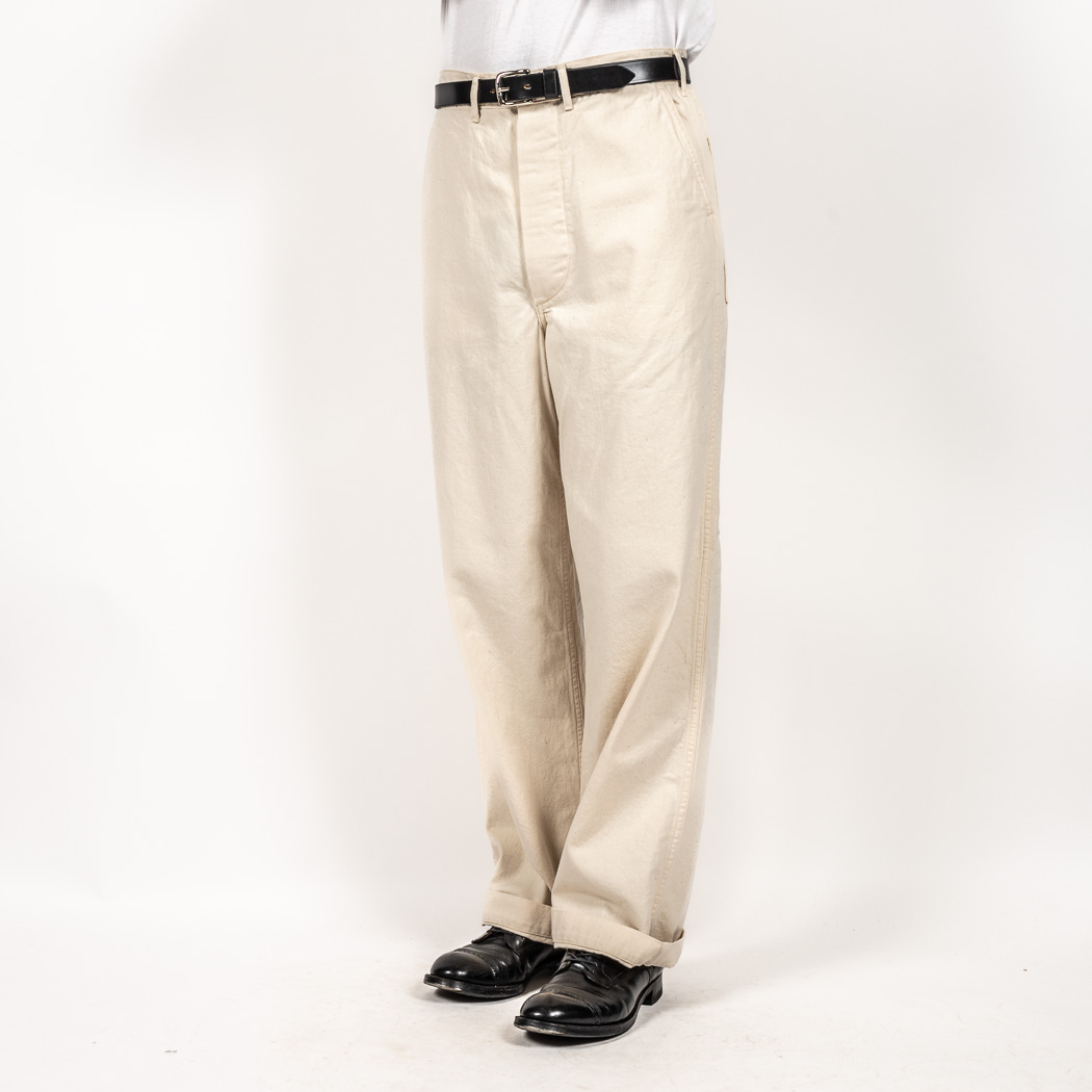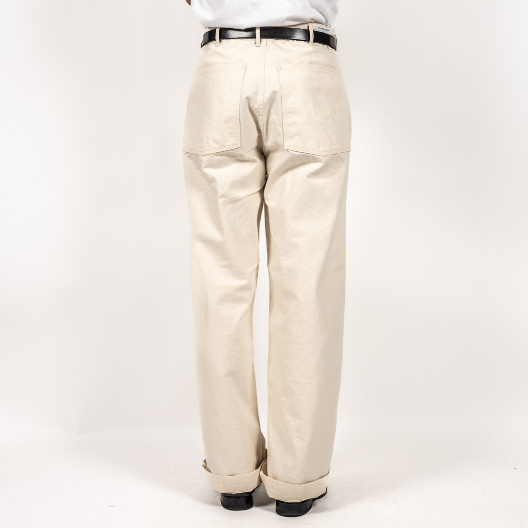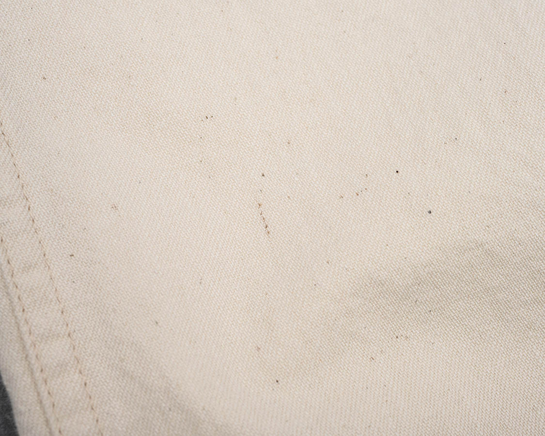 素材、 アレンジで生成りデニム。真っ白ではなく、生成り。そのため、生地表面には綿の葉カスが少し残っています。穿きこみ、汚れて、洗う。繰り返すと徐々に生成りが白っぽくなっていきます。