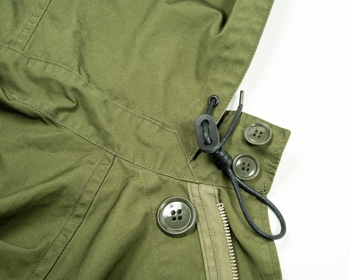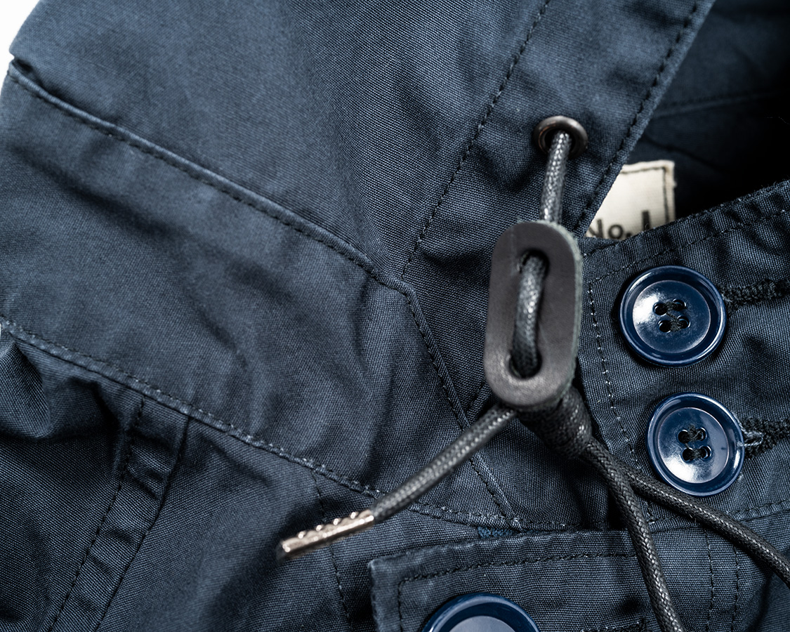 襟、スタンドカラーにフード流し込み部分のアップ。フード口調節の紐、革パーツ。そして手間はかかりますが、ループ状に結んだスピンドル。元ネタがミリタリーなのでデザインが込み入っています。