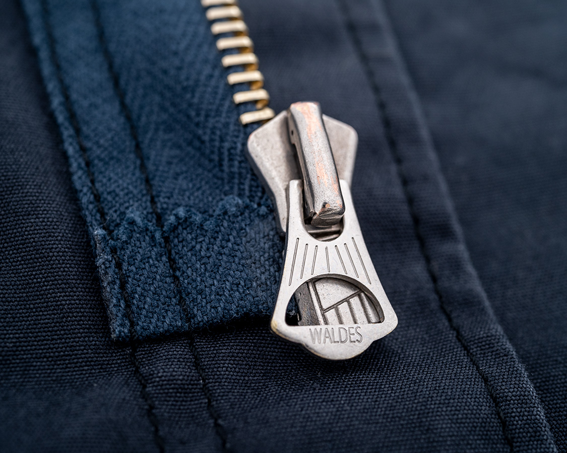 ファスナーはWALDESのオートマチック。元ネタ的には右差し・ヨーロッパ風のデザインを使いたいところですが、ファスナーの強度・上げ下げのスムースさがこれが一番良いと思うので、この形に。 |