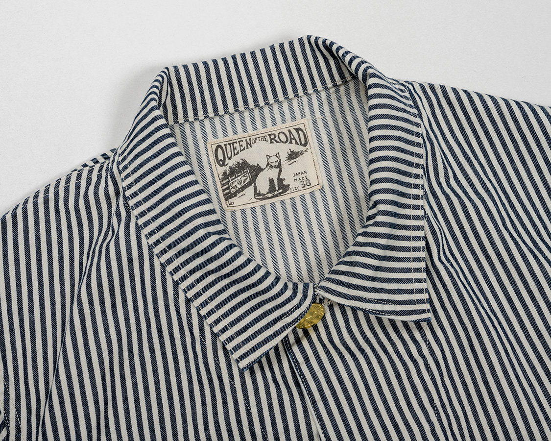 Railroad Jacket、Chore Jacket、日本では「カバーオール」が通っているので、今回はカバーオールとあえて言います。カバーオール、以前作ったSuper Big Cat Jacketがトリプルステッチ+台襟あり。袖口もガントレットカフスと、これでもか!とワークウェアらしい仕様に対し、Queen of the roadは、一枚襟、ダブルステッチ、袖口もごく普通の見返しします。ある意味「地味」なのですが、そこが着る人・機会を選ばない理由。
