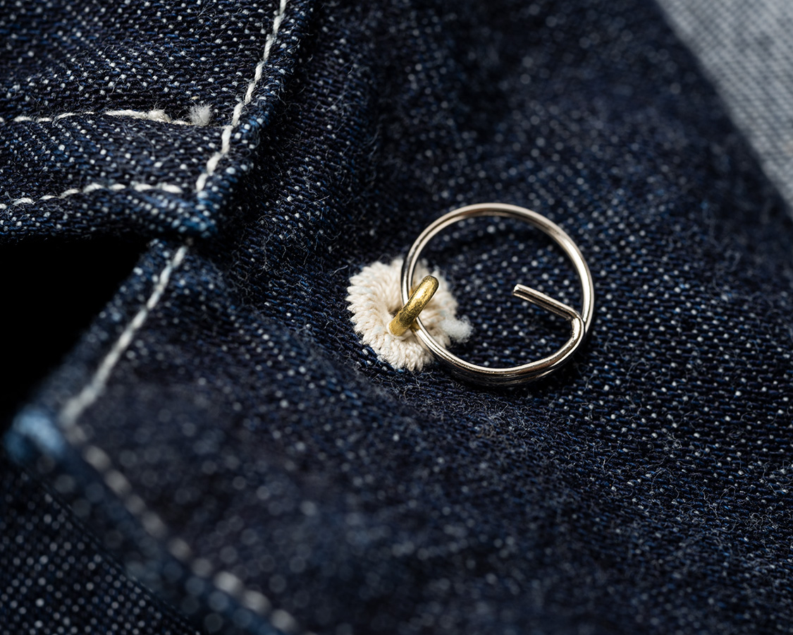 | ボタンはすべてチェンジボタン。糸でかがった菊穴にボタンの足を通し、裏側をリングで止めています。 |