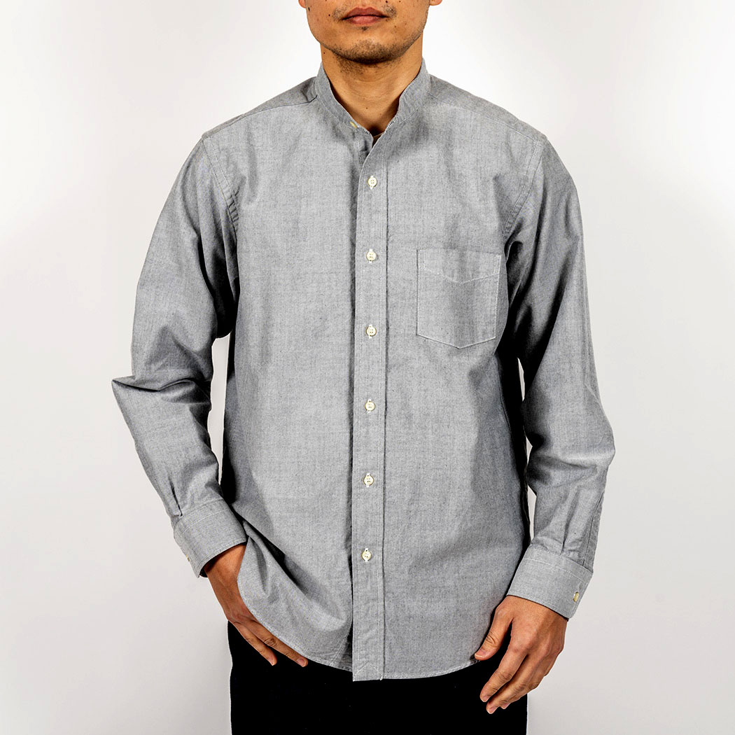 WORKERS のバンドカラーシャツは今までビンテージの細い襟回り、フロントはラウンドで、丈も長く脇の切り上がりが
