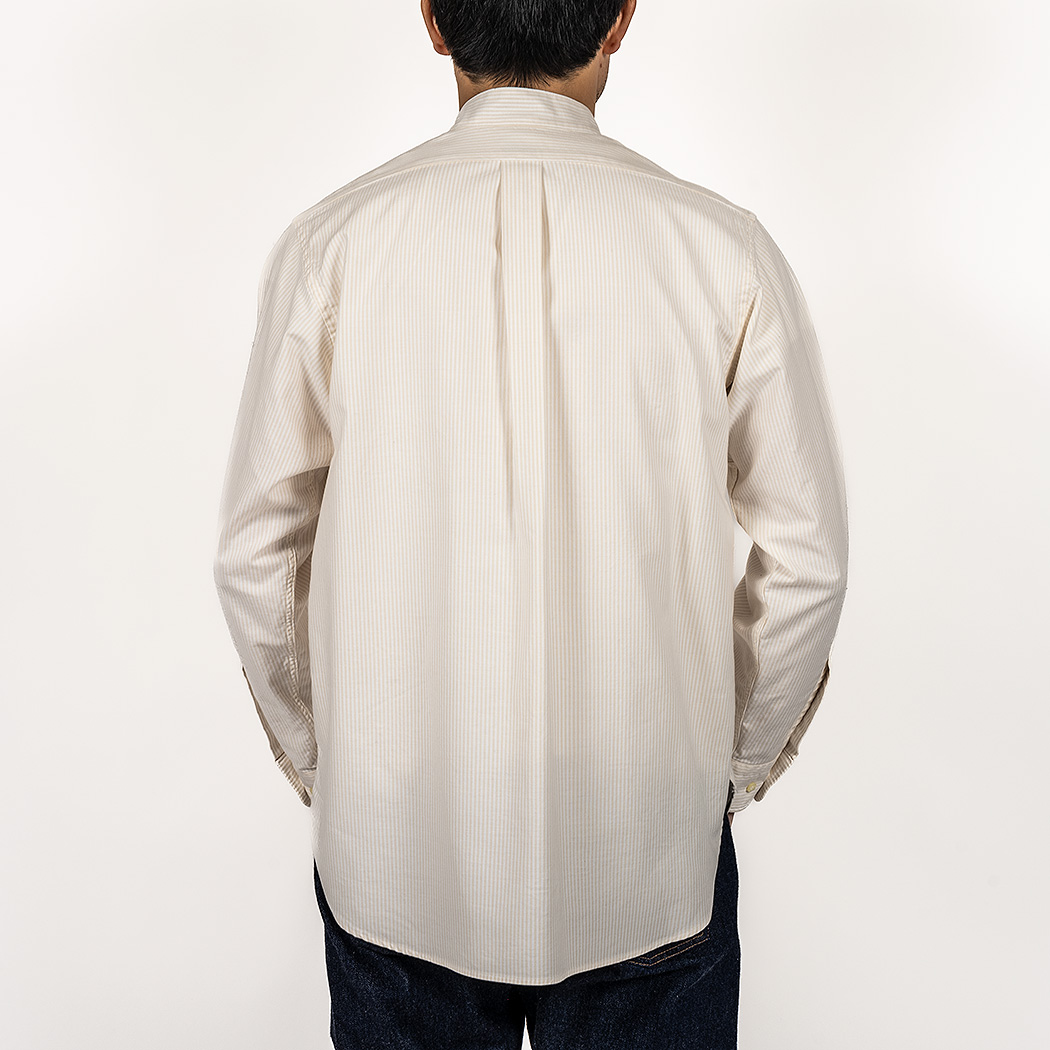 素材、Supima OX は定番の5 オンスクラス。通年着られる厚み。Ecru/ Ecru Stripe はWORKERS 別注。