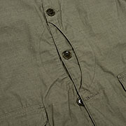 腰の二室ポケット、フロントの三日月型ポケット、内ポケットも左右に二つポケッ ト。フロント・バック共に裏地付。本来、ハンティングで獲物を入れたり、道具を入れて両手をあけるための「道具服」で、 WORKERS 版も「着るバッグ」といった雰囲気。