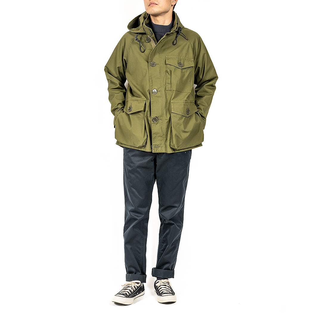 身頃をゆったり、アームホールもゆとりを取ったので中にシャツ+ 中厚セーターまでならOK。ジャケットを着るには裏 地も無いのでちょっときついかな?もっと、Fishtail Parka ぐらい思い切りゆとりを取れば一重のアウターにもなるのですが、そうすると逆に普段、シャツの上に羽織るにはゆったり過ぎる。RAF Parka は秋口や春先に羽織れるシルエットにしたいのでゆとりをつけすぎない、適度なフィット感に調整しています。