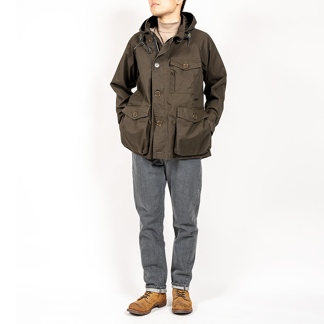 素材は平織りのベンタイル、厚手タイプ。軽い撥水性があり、また着こんでいくと生地が重なっている部分は白化して陰影が出ます。高密度生地には珍しい「育つ」素材。