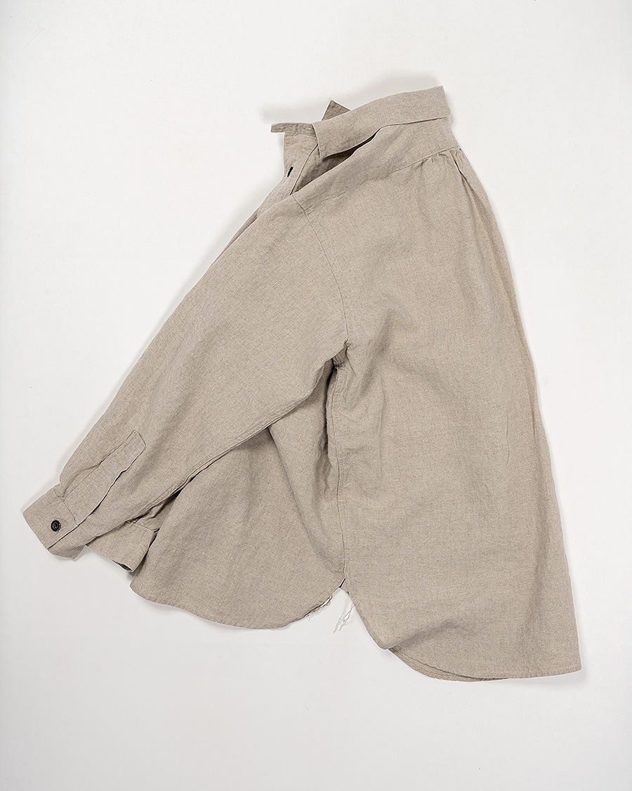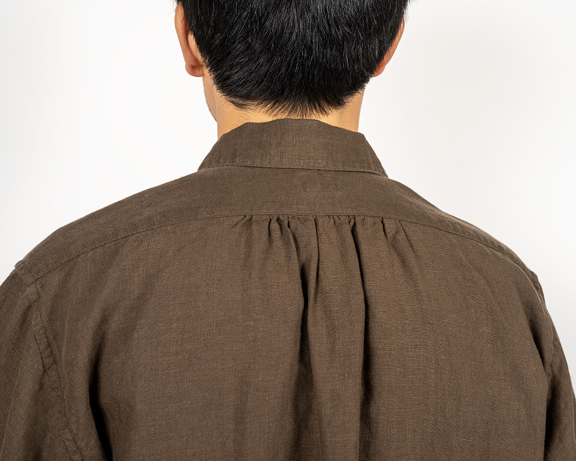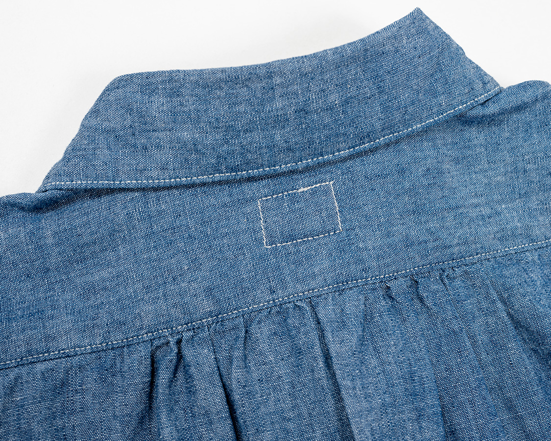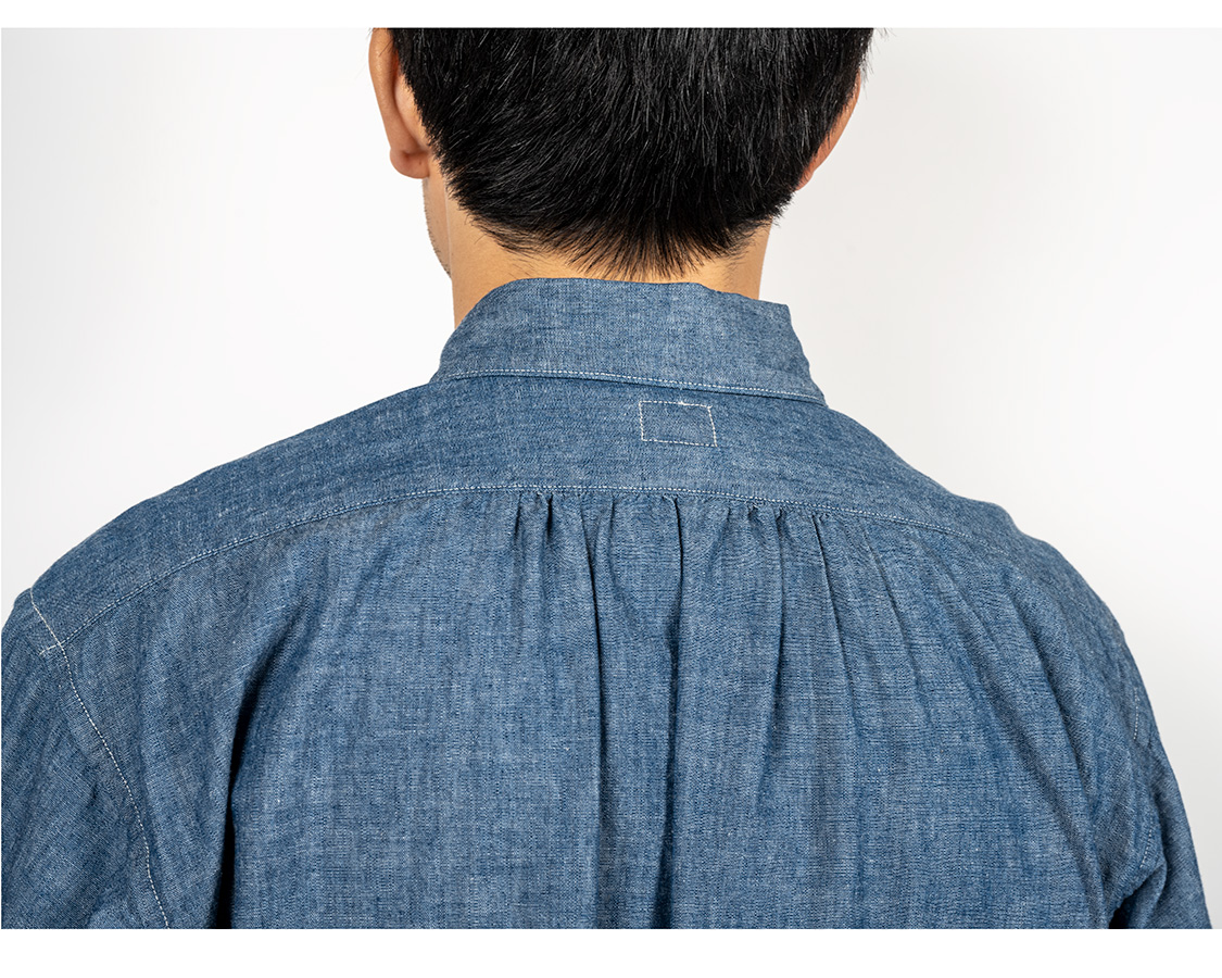 背面の真ん中に細かなシャーリング。もっと現代的なボタンダウンならタックにするだろうし、ワークシャツなら身頃にゆとりを出してタックは無しにする。そこをあえてシャーリングにしていると「クラシックなドレスシャツの名残」を感じる部分。