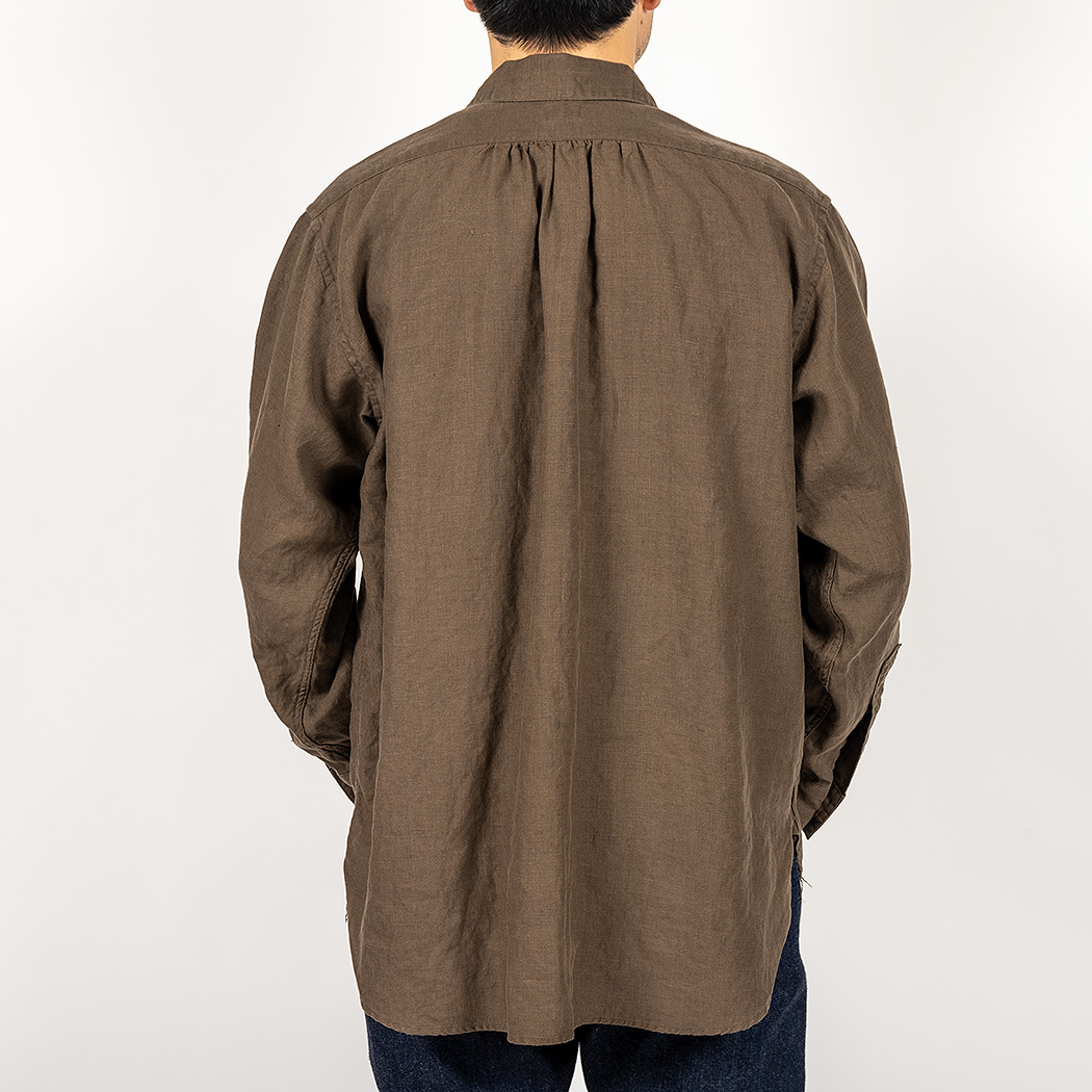 背面、センターに細かいヒダ状のシャーリング。もっと完成された年代のワークシャツは身幅がそもそもゆったり取られ、背面にシャーリングやタックはありませんが、ここはドレスシャツの雰囲気を残して。 |