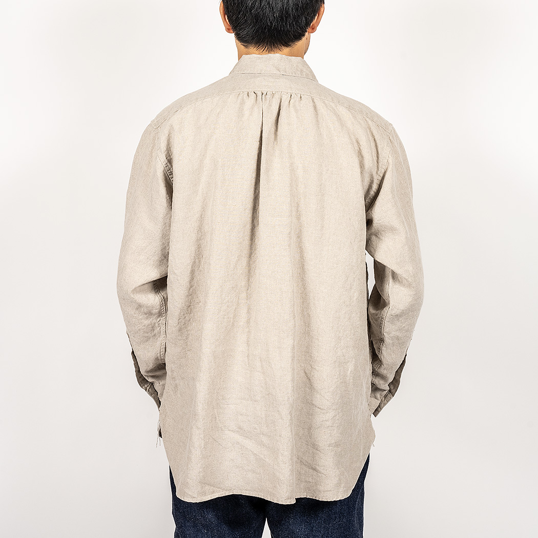 素材、リネン2 色はWORKERS定番の5.5 オンス。通年着られる厚み。生地洗い、揉みを何回も行い、リネンで起こり がちなチクチク感をほぼ完全に取り除いています。でもしっかり、リネンらしいプルプルした腰があるのは元がある程度厚い生地だから。