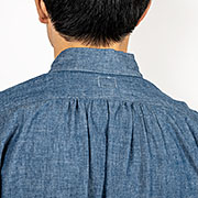 背面、センターに細かいヒダ状のシャーリング。もっと完成された年代のワークシャツは身幅がそもそもゆったり取られ、背面にシャーリングやタックはありませんが、ここはドレスシャツの雰囲気を残して。