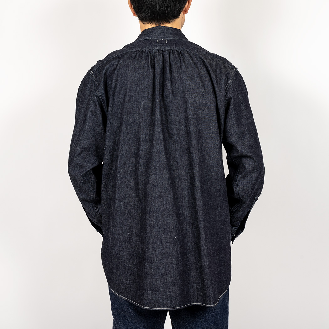 背面、センターに細かいヒダ状のシャーリング。もっと完成された年代のワークシャツは身幅がそもそもゆったり取られ、背面にシャーリングやタックはありませんが、ここはドレスシャツの雰囲気を残して。 |