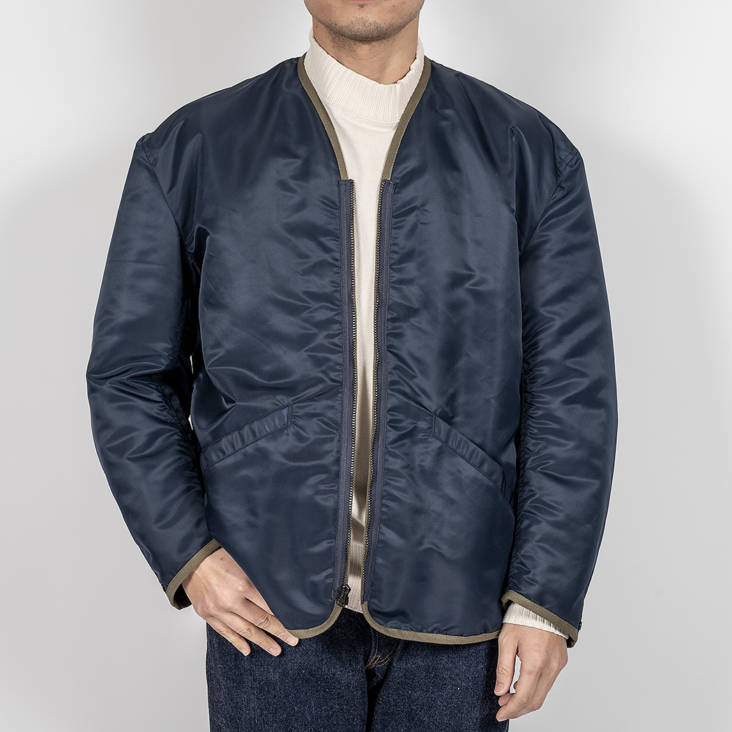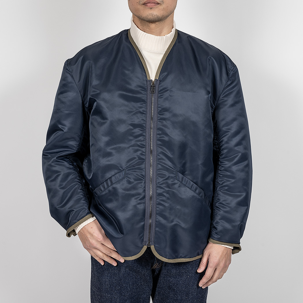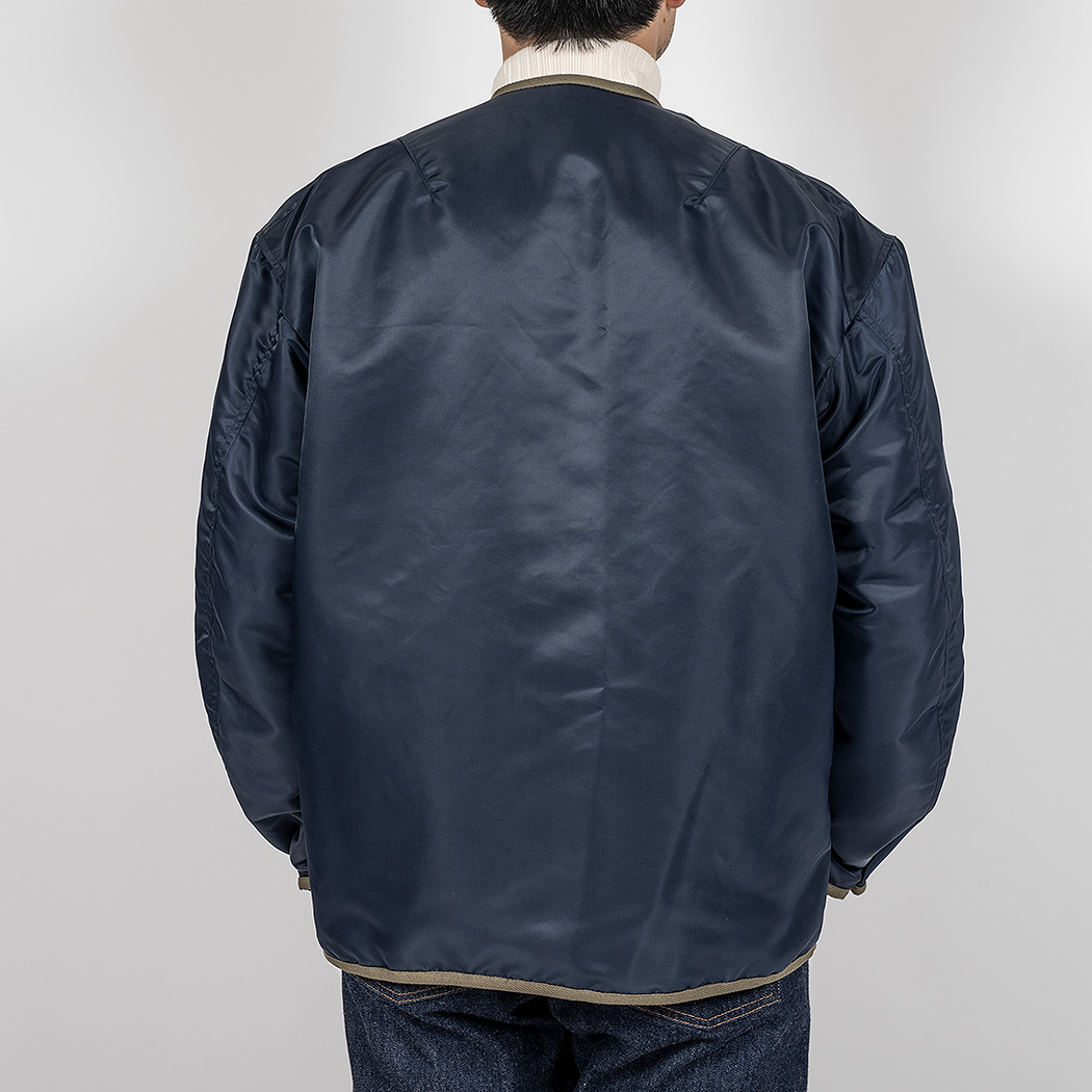 裏地、ビンテージのL-2Bに使われているコットン/ウールではなくあえてコットン/レーヨンツイル。ウールが入るとどうしても、扱いが少し難しくなるので。