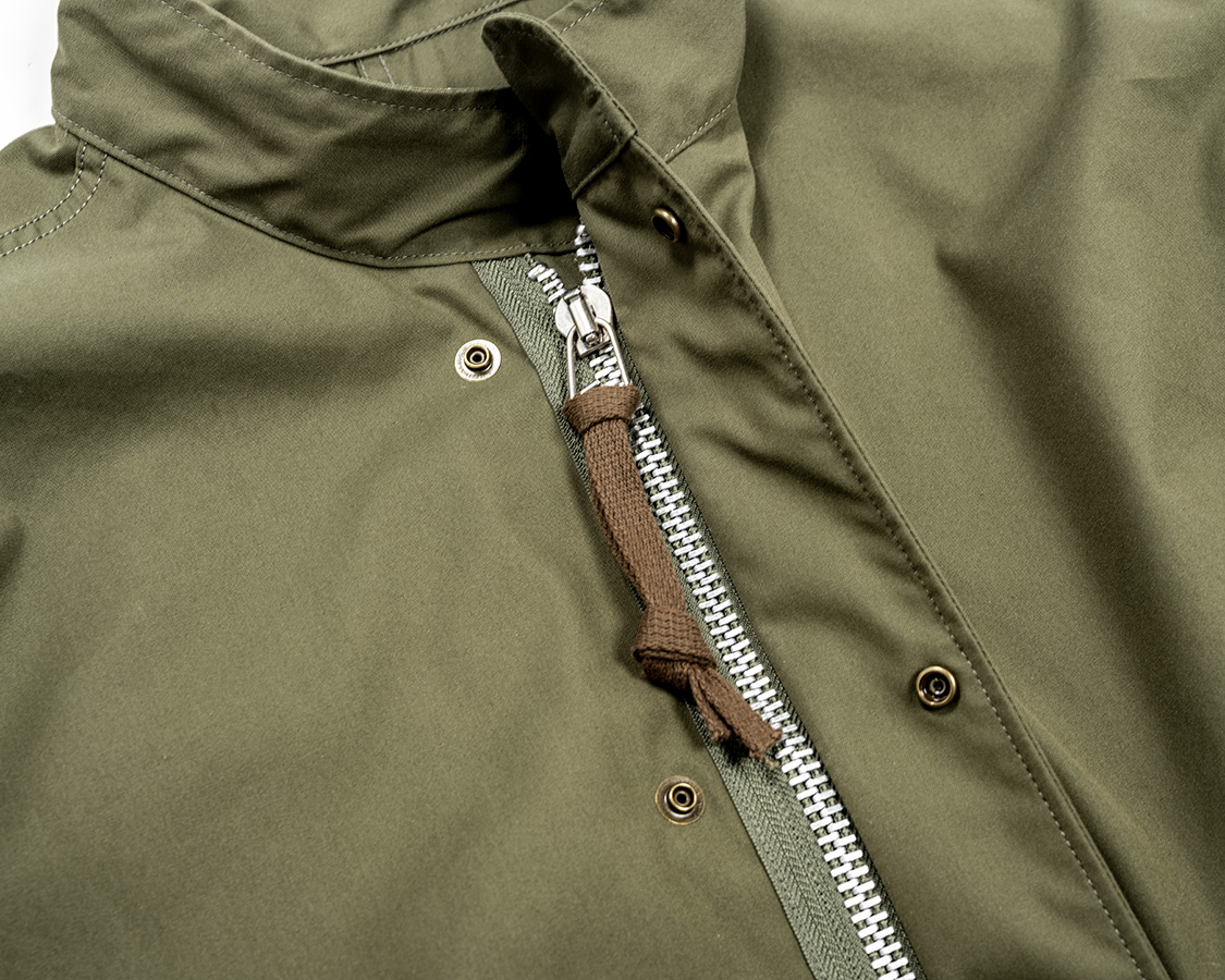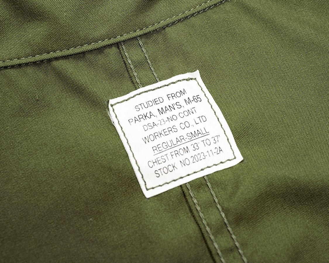 M-65、フィッシュテールの特徴。襟が台襟。ミリタリーでは着脱式のフードがつきますが、WORKERS版は割り切ってフードはつきません。というのも・・・