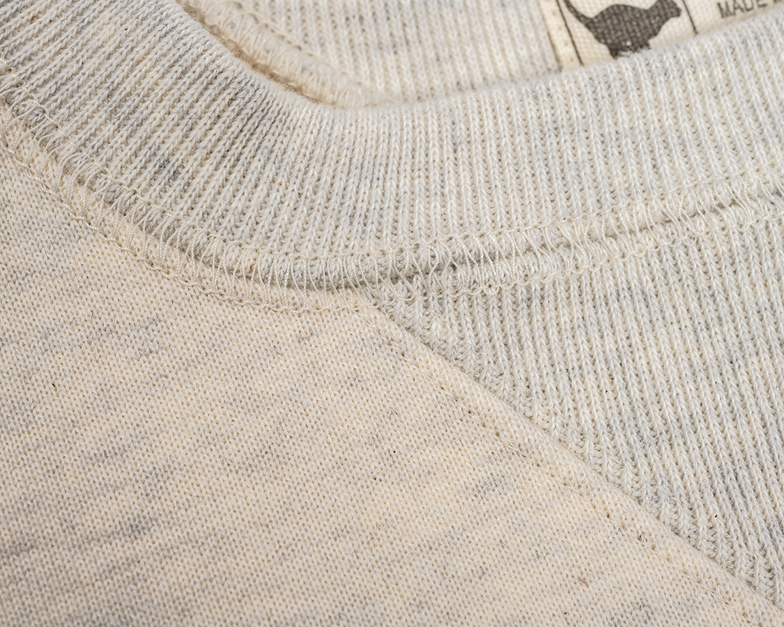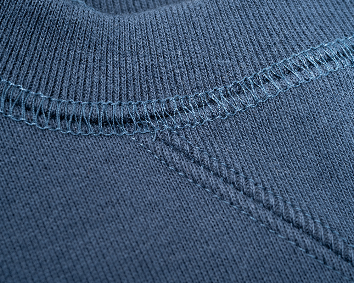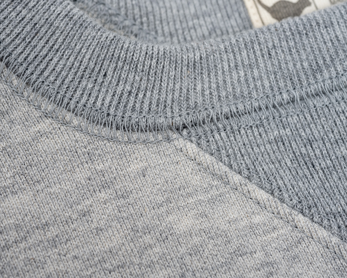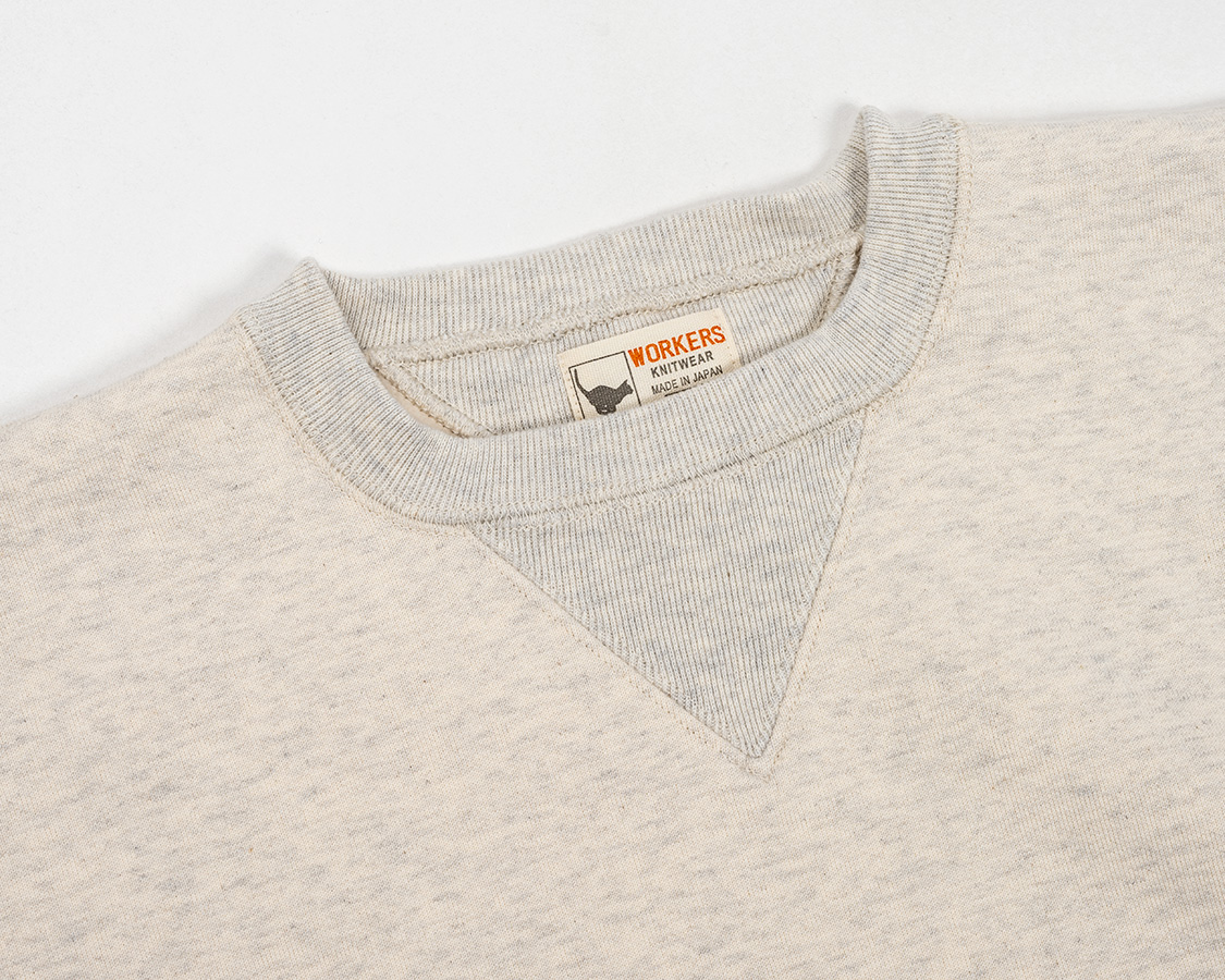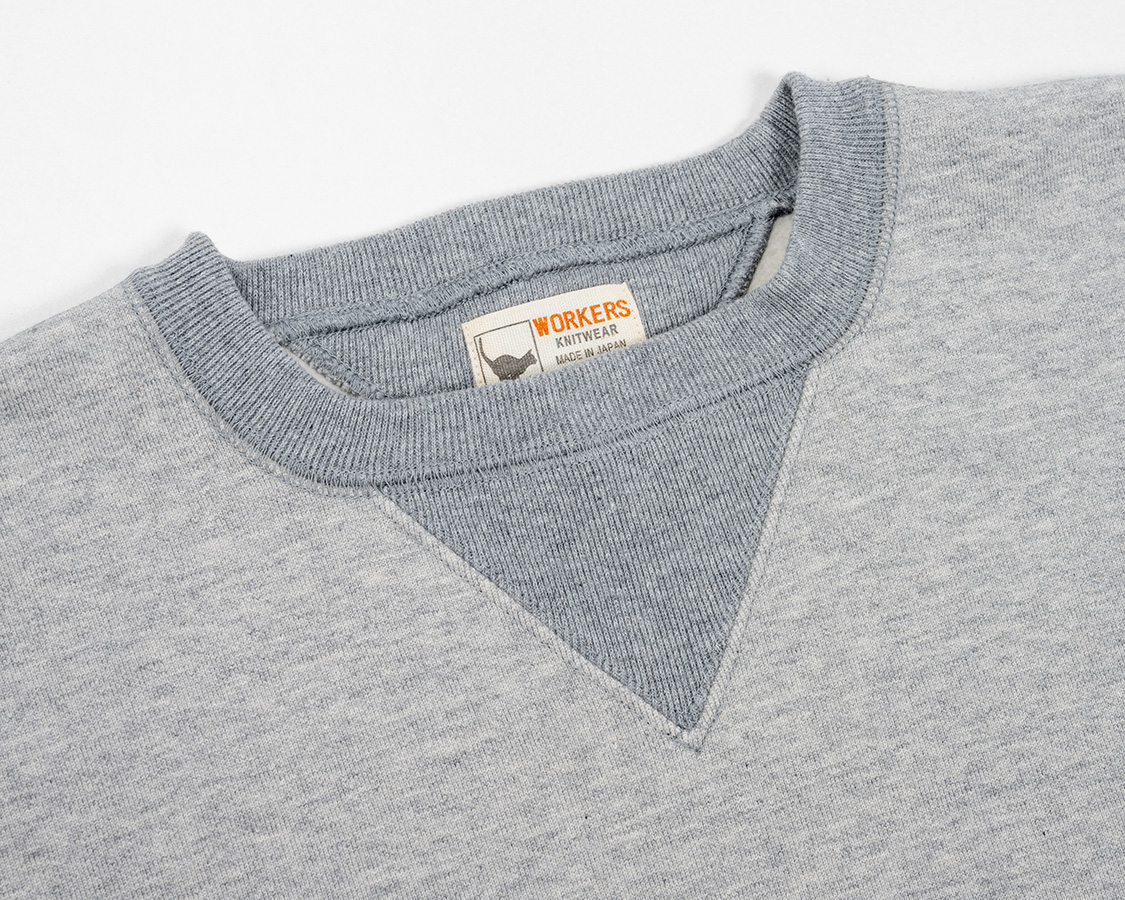 綿100%の裏毛(身頃に使っている)は伸び縮みが少ない。それに対し、リブは綿100でもある程度伸び縮みする。そこで、身頃の一部をカットしてリブで置き換えるのがこのVの意味。身頃では足らない「頭を通る時の伸び」が「V字のリブ」であれば実現できるので。