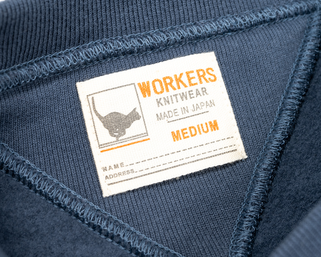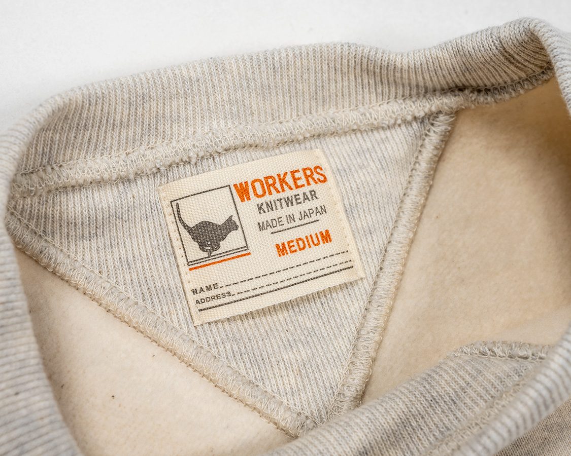 直線的なパターン。肩が落ち、直線的な袖付け。古いスウェットのパターンを参考にしつつ、めったにビンテージで出てこない「大きめサイズ」をパターンで再現しています。