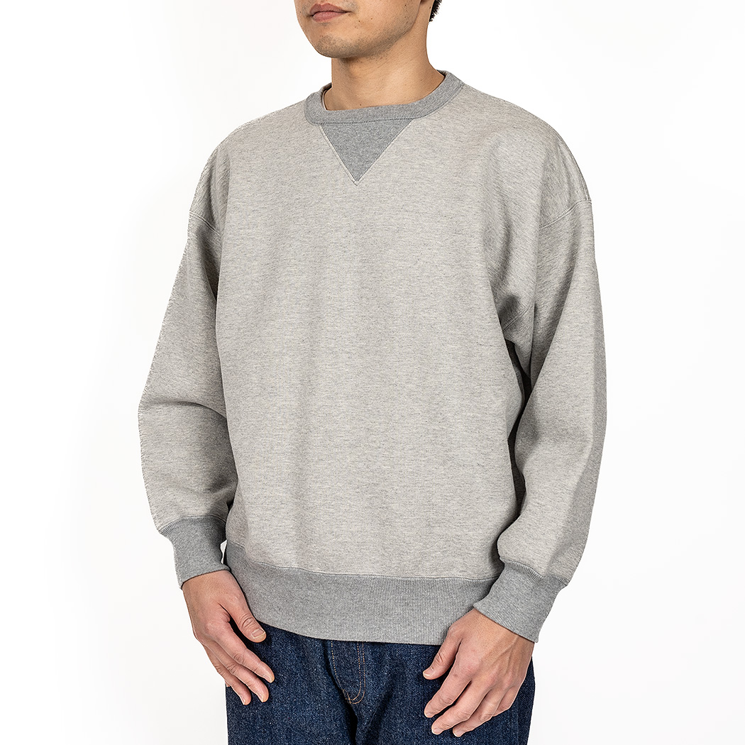 表30 番・中30 番・裏7 番で、裏の糸ループを短く編み、 さらに起毛をかけた本格的冬用スウェットです。18ゲージでガチガチに目を詰めて編んでいるので形崩れしにくい。重さ15 オンス程あり、いわゆる「超ヘビーウェイトスウェット」 でも化繊は使っていないのでしなやか。