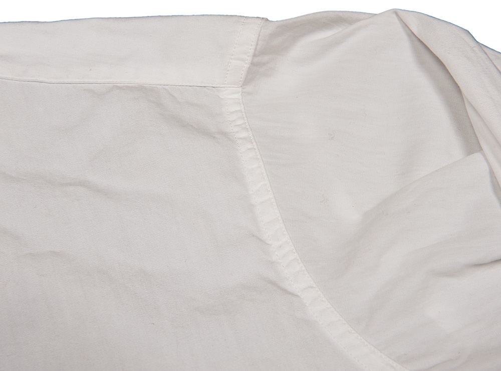 ドレスシャツでありながら、袖ぐりはワークシャツのような二本針チェーンステッチの巻き縫い。