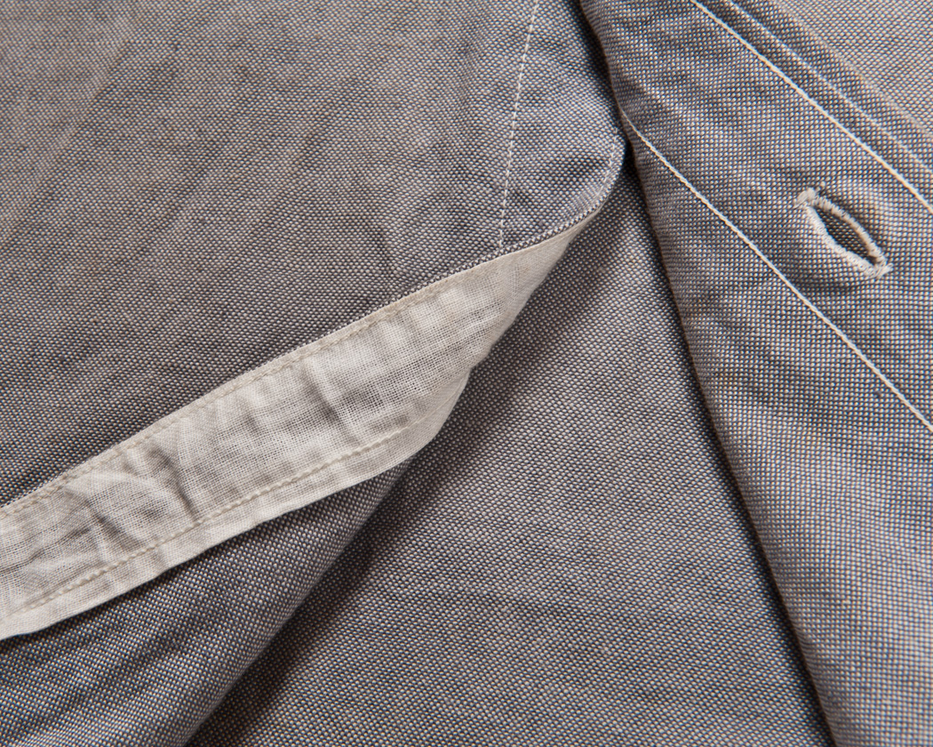 上前は載せ前立て。別布をラッパで折りこみながら、前立て縫いミシンで一気に縫われています。